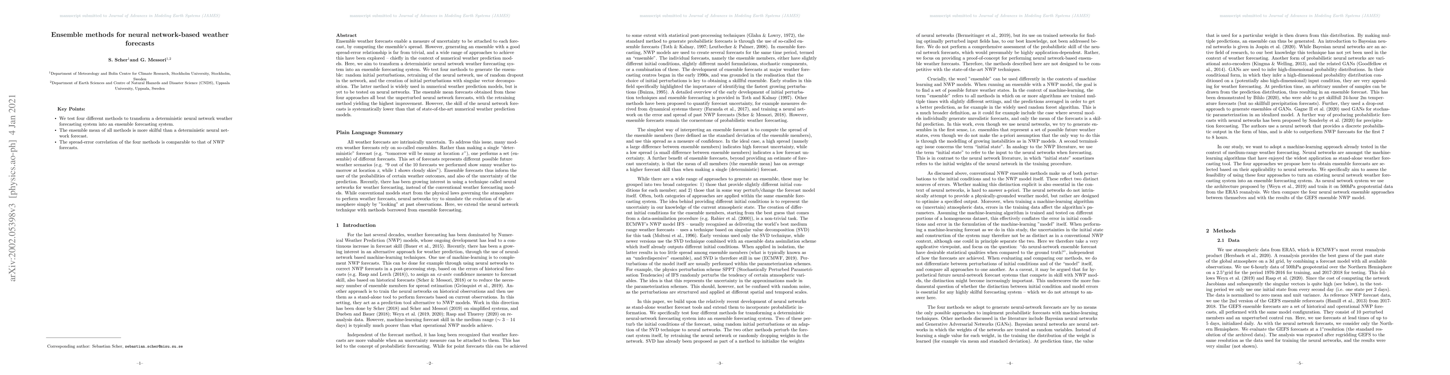 This paper explores ensemble methods for enhancing neural network-based weather forecasts, testing four approaches: random initial perturbations, retraining, random dropout, and singular vector decomposition. The ensemble forecasts outperform the deterministic model, with retraining showing the most significant improvement, though they remain less accurate than state-of-the-art numerical models.