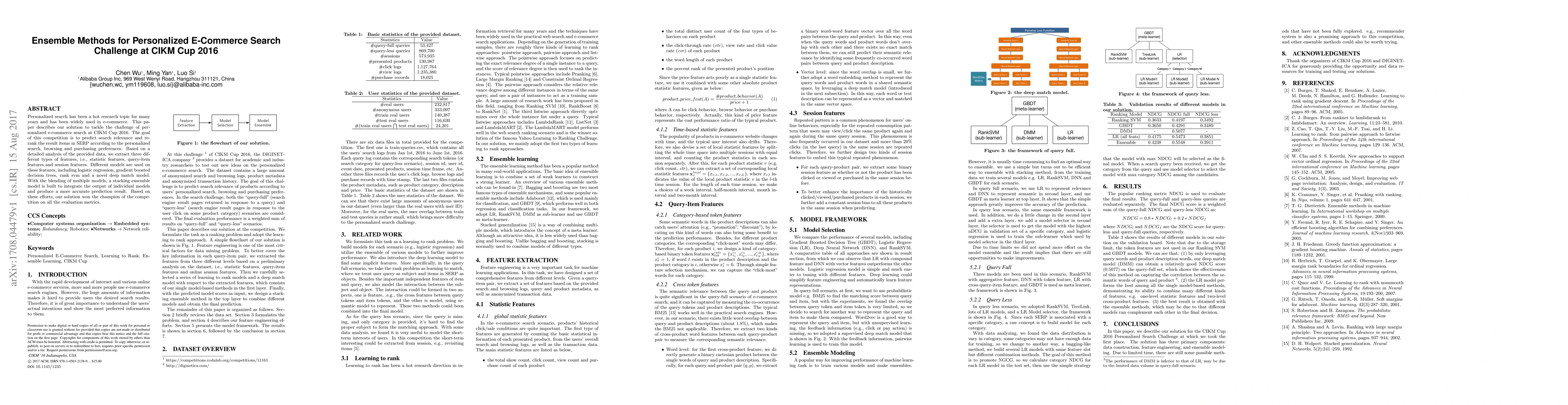 Personalized search has been a hot research topic for many years and has been widely used in e-commerce. This paper describes our solution to tackle the challenge of personalized e-commerce search at CIKM Cup 2016. The goal of this competition is to predict search relevance and re-rank the result items in SERP according to the personalized search, browsing and purchasing preferences. Based on a detailed analysis of the provided data, we extract three different types of features, i.e., statistic features, query-item features and session features. Different models are used on these features, including logistic regression, gradient boosted decision trees, rank svm and a novel deep match model. With the blending of multiple models, a stacking ensemble model is built to integrate the output of individual models and produce a more accurate prediction result. Based on these efforts, our solution won the champion of the competition on all the evaluation metrics.