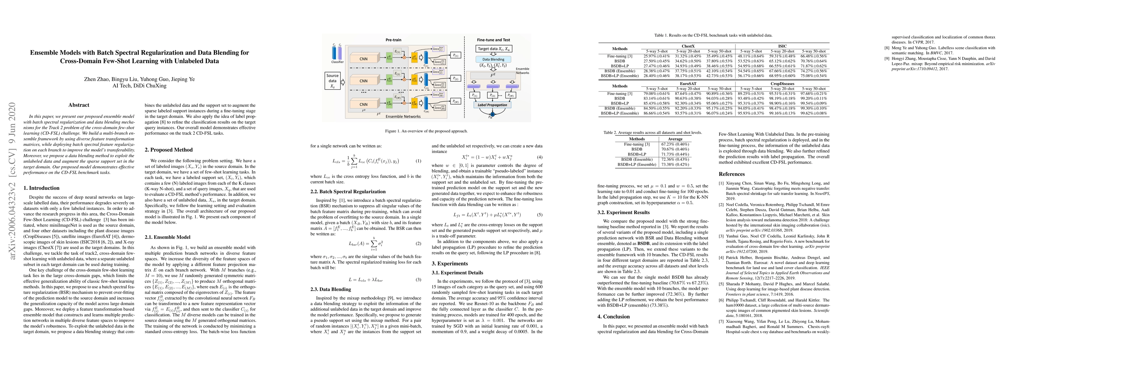 This paper proposes an ensemble model integrating batch spectral regularization and data blending for cross-domain few-shot learning with unlabeled data. The model employs a multi-branch framework with spectral regularization and a data blending technique to enhance transferability and utilize unlabeled data, achieving effective results on benchmark tasks.