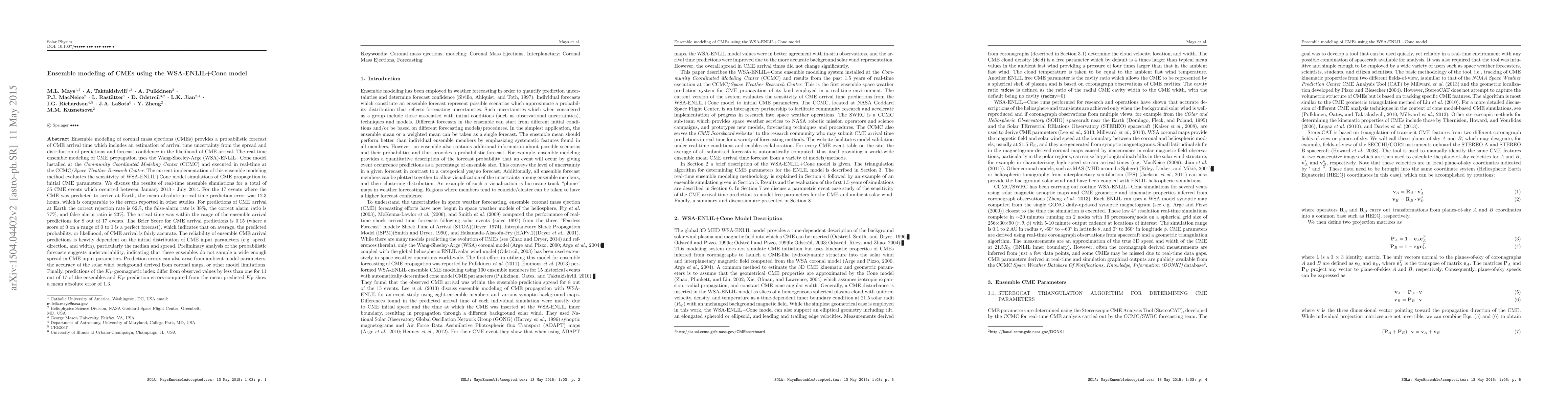 This paper evaluates the WSA-ENLIL+Cone ensemble model for predicting Coronal Mass Ejection (CME) arrival times, finding a mean absolute error of 12.3 hours. The model shows a 62% correct rejection rate and 38% false-alarm rate for CME arrivals at Earth, with undervariability in ensemble predictions.