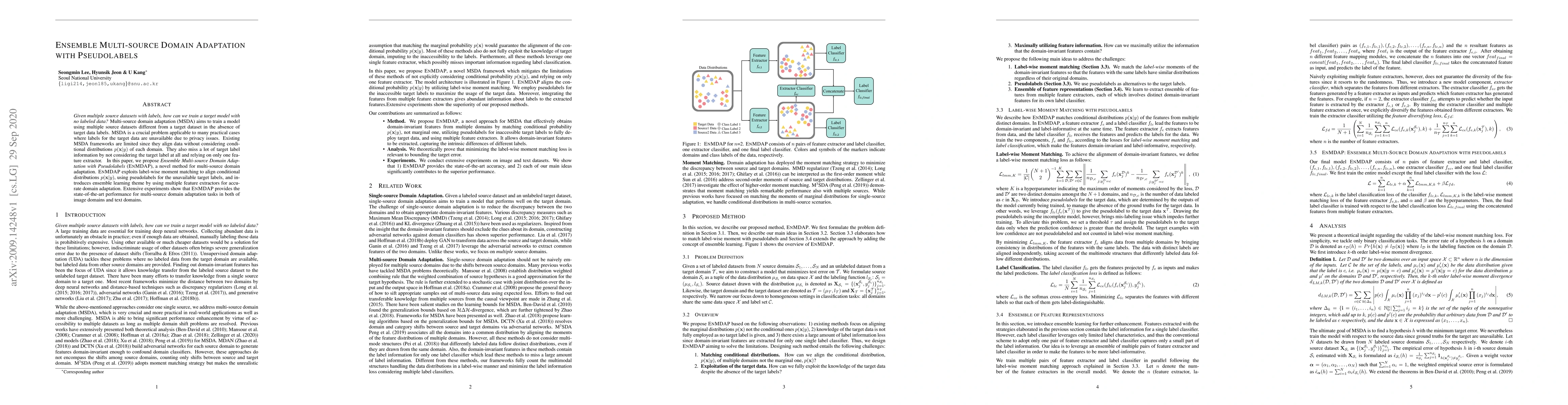This paper proposes Ensemble Multi-Source Domain Adaptation with Pseudolabels (EnMDAP) to address the challenge of training models using multiple source datasets without labeled target data. EnMDAP aligns conditional distributions using pseudolabels and employs ensemble learning with multiple feature extractors for improved domain adaptation.