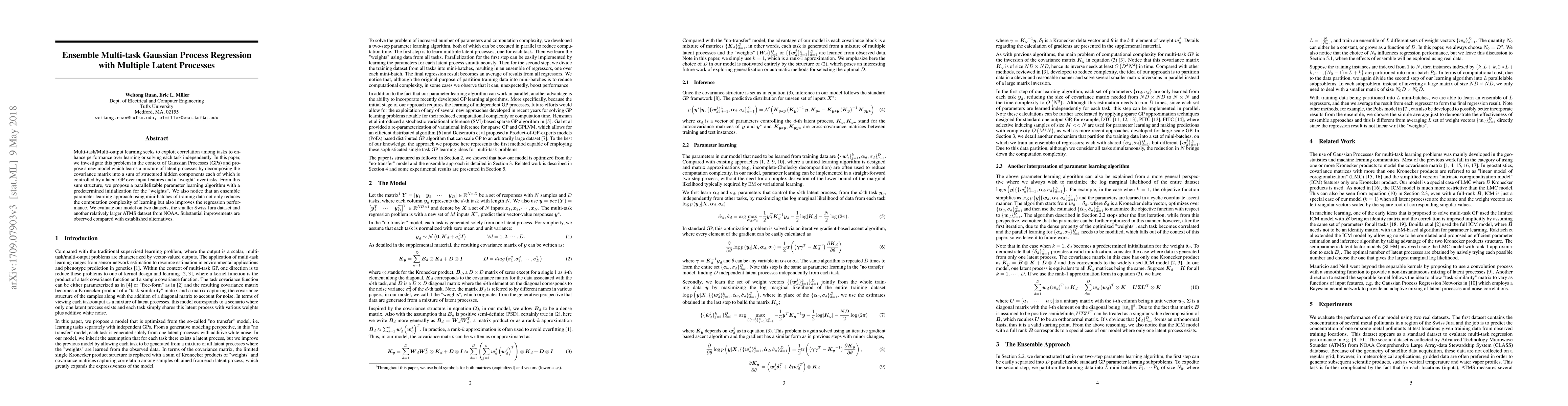 This paper proposes an ensemble multi-task Gaussian Process Regression model that learns a mixture of latent processes to exploit correlations among tasks. The model decomposes the covariance matrix and uses a parallelizable algorithm with mini-batch training to improve performance and reduce computational complexity.