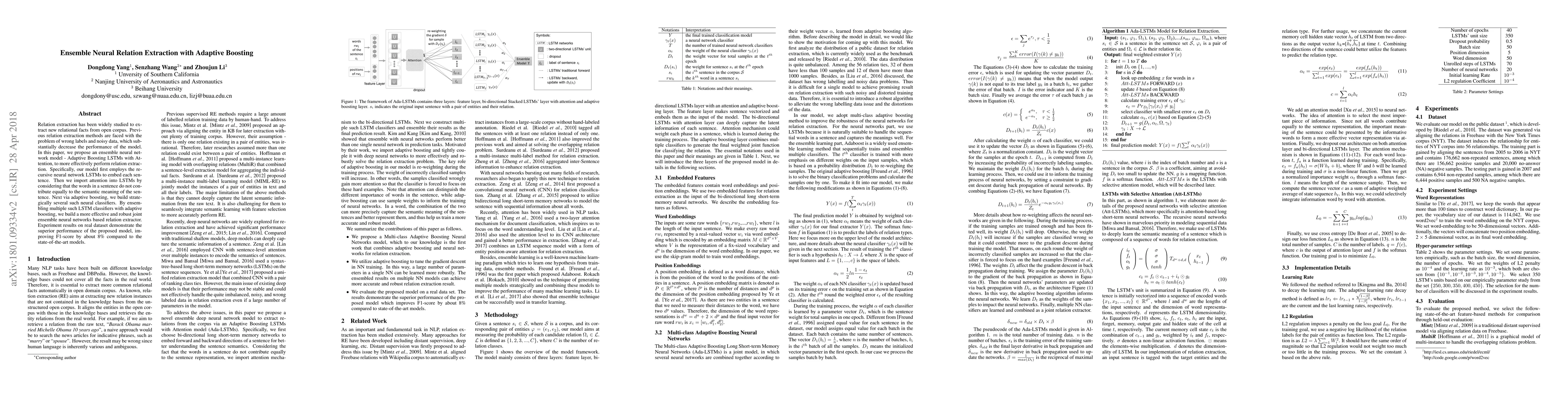 This paper proposes an ensemble neural network model, Adaptive Boosting LSTMs with Attention, to enhance relation extraction from open corpus. The model combines LSTMs with attention mechanisms and adaptive boosting to build robust classifiers, achieving an 8% improvement in F1-score over state-of-the-art methods.