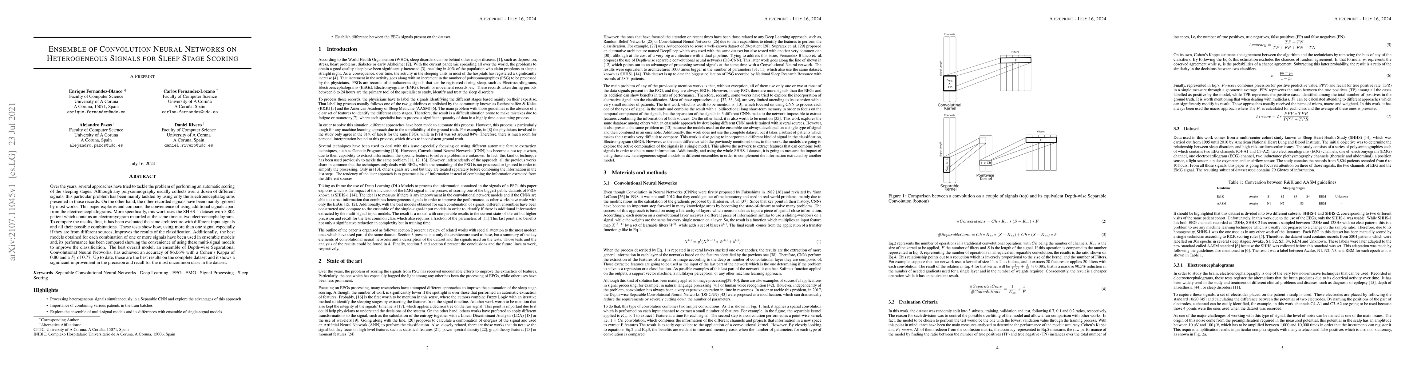 Over the years, several approaches have tried to tackle the problem of performing an automatic scoring of the sleeping stages. Although any polysomnography usually collects over a dozen of different signals, this particular problem has been mainly tackled by using only the Electroencephalograms presented in those records. On the other hand, the other recorded signals have been mainly ignored by most works. This paper explores and compares the convenience of using additional signals apart from electroencephalograms. More specifically, this work uses the SHHS-1 dataset with 5,804 patients containing an electromyogram recorded simultaneously as two electroencephalograms. To compare the results, first, the same architecture has been evaluated with different input signals and all their possible combinations. These tests show how, using more than one signal especially if they are from different sources, improves the results of the classification. Additionally, the best models obtained for each combination of one or more signals have been used in ensemble models and, its performance has been compared showing the convenience of using these multi-signal models to improve the classification. The best overall model, an ensemble of Depth-wise Separational Convolutional Neural Networks, has achieved an accuracy of 86.06\% with a Cohen's Kappa of 0.80 and a $F_{1}$ of 0.77. Up to date, those are the best results on the complete dataset and it shows a significant improvement in the precision and recall for the most uncommon class in the dataset.