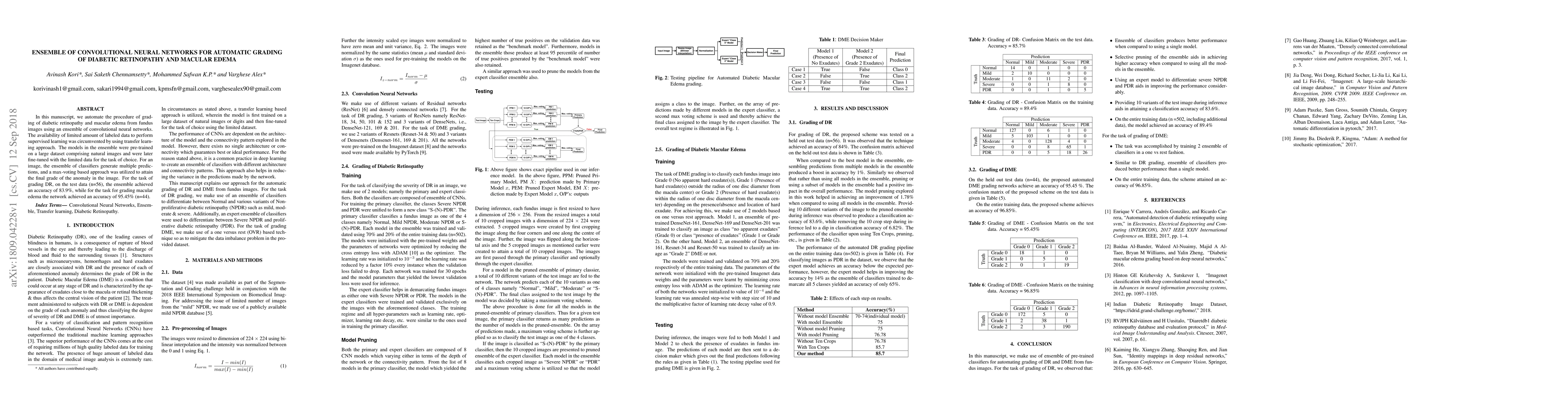 In this manuscript, we automate the procedure of grading of diabetic retinopathy and macular edema from fundus images using an ensemble of convolutional neural networks. The availability of limited amount of labeled data to perform supervised learning was circumvented by using transfer learning approach. The models in the ensemble were pre-trained on a large dataset comprising natural images and were later fine-tuned with the limited data for the task of choice. For an image, the ensemble of classifiers generate multiple predictions, and a max-voting based approach was utilized to attain the final grade of the anomaly in the image. For the task of grading DR, on the test data (n=56), the ensemble achieved an accuracy of 83.9\%, while for the task for grading macular edema the network achieved an accuracy of 95.45% (n=44).