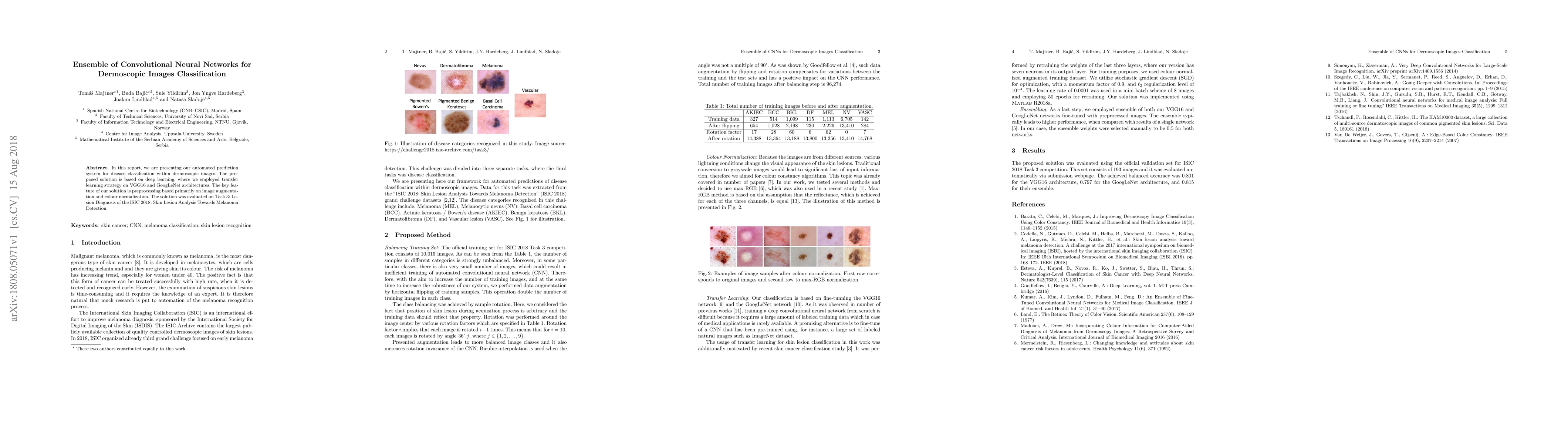 In this report, we are presenting our automated prediction system for disease classification within dermoscopic images. The proposed solution is based on deep learning, where we employed transfer learning strategy on VGG16 and GoogLeNet architectures. The key feature of our solution is preprocessing based primarily on image augmentation and colour normalization. The solution was evaluated on Task 3: Lesion Diagnosis of the ISIC 2018: Skin Lesion Analysis Towards Melanoma Detection.