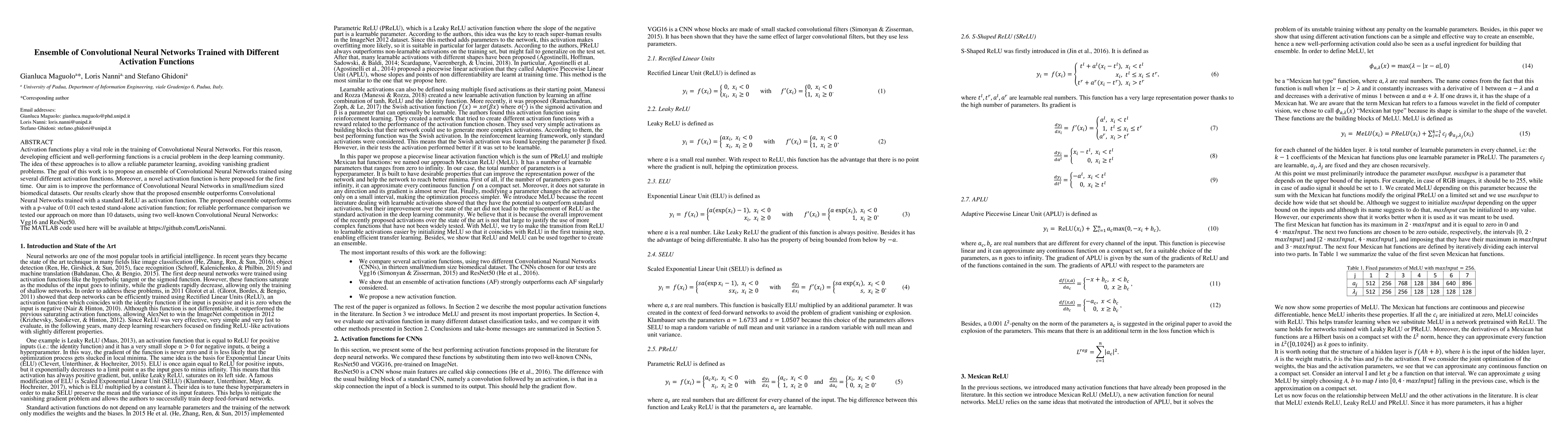 This paper proposes an ensemble of Convolutional Neural Networks (CNNs) trained with various activation functions, including a novel one, to improve performance on small/medium biomedical datasets. The results show that the ensemble outperforms standard ReLU-based CNNs, achieving statistical significance with a p-value of 0.01 across multiple datasets and architectures.