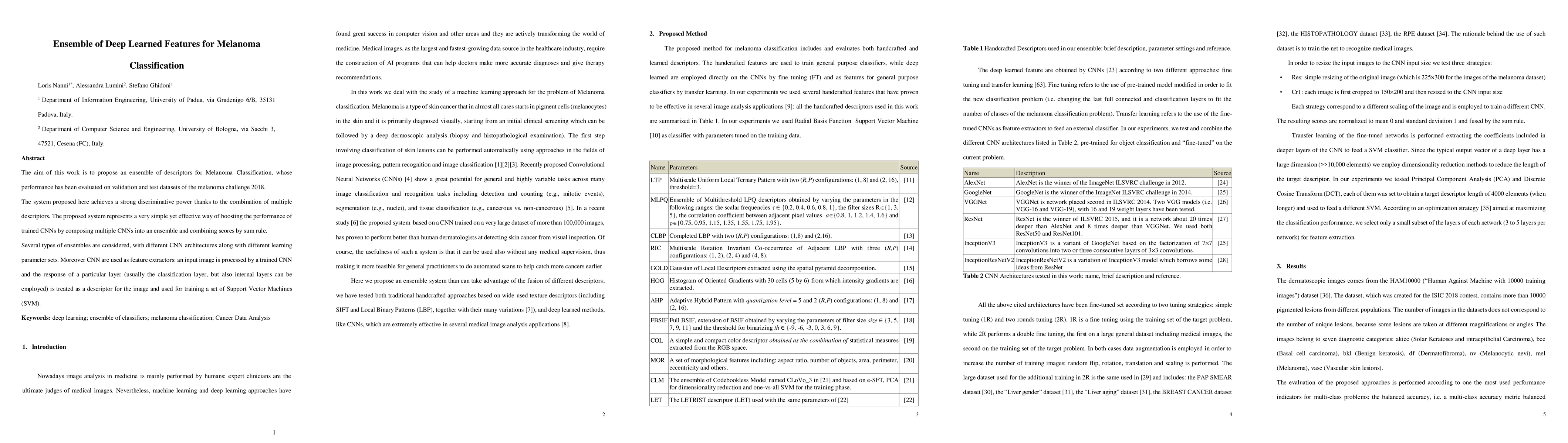 This paper proposes an ensemble of deep learning features for melanoma classification, combining multiple convolutional neural networks (CNNs) to enhance discriminative performance. The system uses CNNs as feature extractors and trains Support Vector Machines (SVMs) on these features, achieving strong classification results on melanoma datasets.