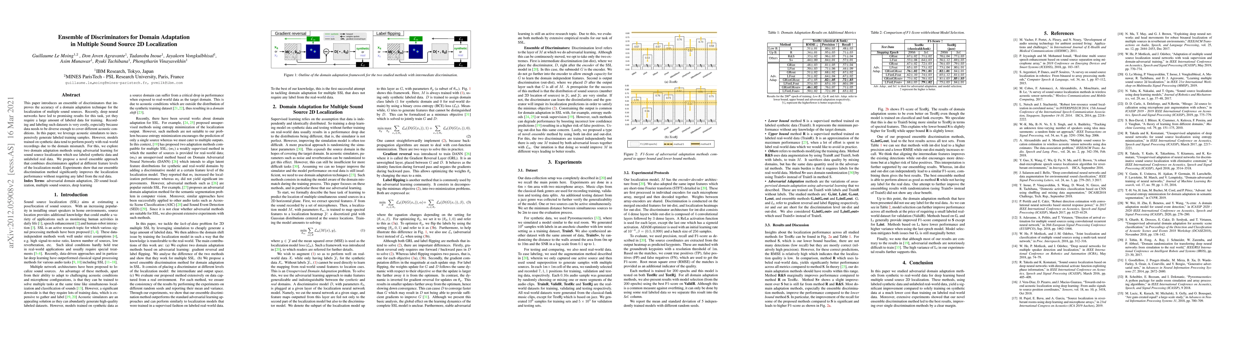 This paper introduces an ensemble of discriminators to improve sound source localization accuracy without requiring labeled real-world data, using synthetic data generated with acoustic simulators.