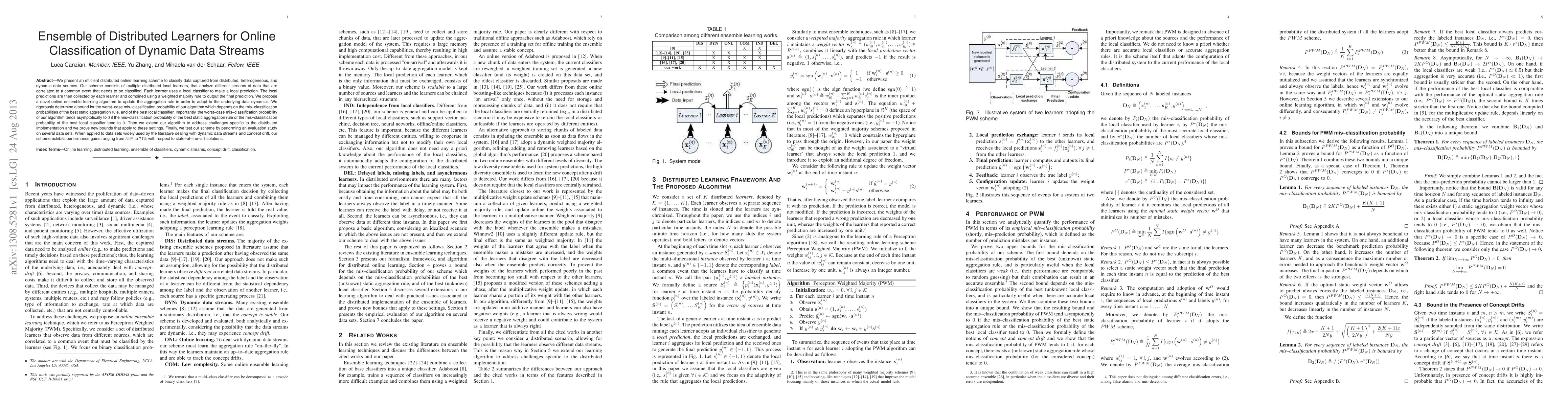 We present an efficient distributed online learning scheme to classify data captured from distributed, heterogeneous, and dynamic data sources. Our scheme consists of multiple distributed local learners, that analyze different streams of data that are correlated to a common event that needs to be classified. Each learner uses a local classifier to make a local prediction. The local predictions are then collected by each learner and combined using a weighted majority rule to output the final prediction. We propose a novel online ensemble learning algorithm to update the aggregation rule in order to adapt to the underlying data dynamics. We rigorously determine a bound for the worst case misclassification probability of our algorithm which depends on the misclassification probabilities of the best static aggregation rule, and of the best local classifier. Importantly, the worst case misclassification probability of our algorithm tends asymptotically to 0 if the misclassification probability of the best static aggregation rule or the misclassification probability of the best local classifier tend to 0. Then we extend our algorithm to address challenges specific to the distributed implementation and we prove new bounds that apply to these settings. Finally, we test our scheme by performing an evaluation study on several data sets. When applied to data sets widely used by the literature dealing with dynamic data streams and concept drift, our scheme exhibits performance gains ranging from 34% to 71% with respect to state of the art solutions.