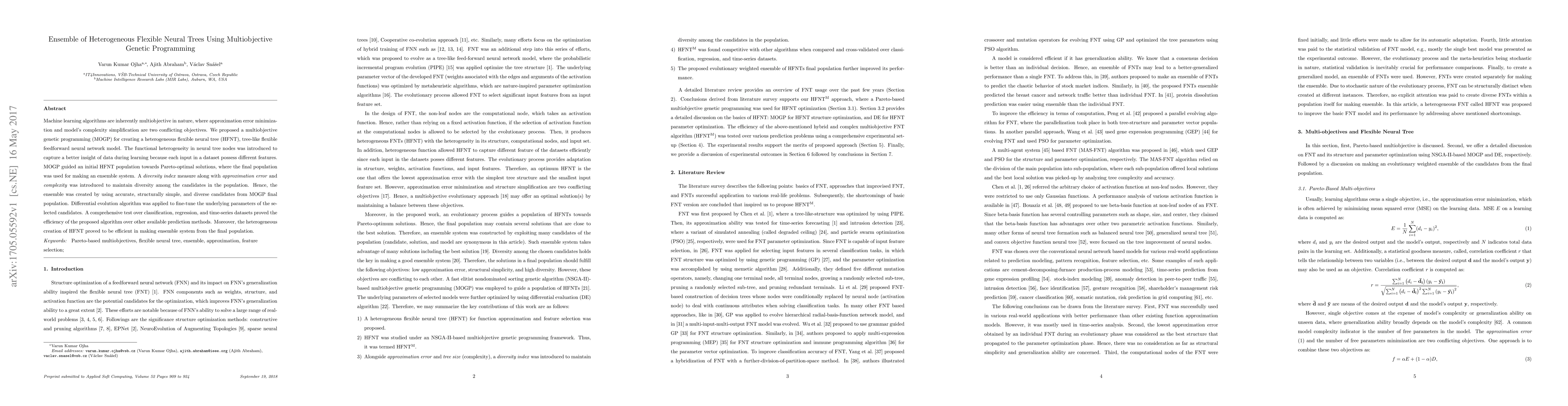 Machine learning algorithms are inherently multiobjective in nature, where approximation error minimization and model's complexity simplification are two conflicting objectives. We proposed a multiobjective genetic programming (MOGP) for creating a heterogeneous flexible neural tree (HFNT), tree-like flexible feedforward neural network model. The functional heterogeneity in neural tree nodes was introduced to capture a better insight of data during learning because each input in a dataset possess different features. MOGP guided an initial HFNT population towards Pareto-optimal solutions, where the final population was used for making an ensemble system. A diversity index measure along with approximation error and complexity was introduced to maintain diversity among the candidates in the population. Hence, the ensemble was created by using accurate, structurally simple, and diverse candidates from MOGP final population. Differential evolution algorithm was applied to fine-tune the underlying parameters of the selected candidates. A comprehensive test over classification, regression, and time-series datasets proved the efficiency of the proposed algorithm over other available prediction methods. Moreover, the heterogeneous creation of HFNT proved to be efficient in making ensemble system from the final population.