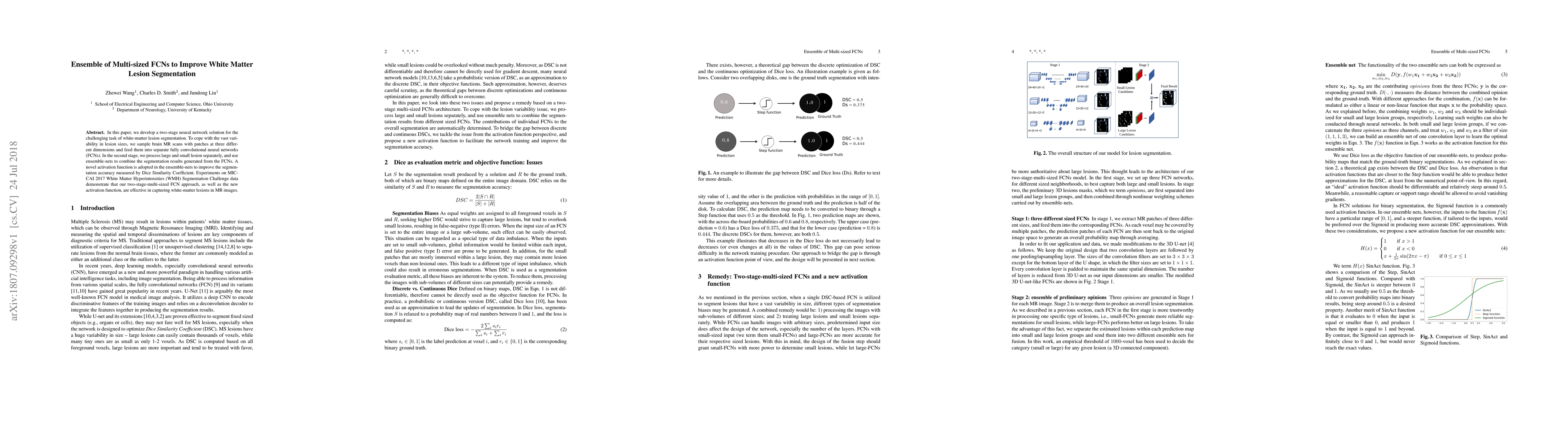 In this paper, we develop a two-stage neural network solution for the challenging task of white-matter lesion segmentation. To cope with the vast vari- ability in lesion sizes, we sample brain MR scans with patches at three differ- ent dimensions and feed them into separate fully convolutional neural networks (FCNs). In the second stage, we process large and small lesion separately, and use ensemble-nets to combine the segmentation results generated from the FCNs. A novel activation function is adopted in the ensemble-nets to improve the segmen- tation accuracy measured by Dice Similarity Coefficient. Experiments on MICCAI 2017 White Matter Hyperintensities (WMH) Segmentation Challenge data demonstrate that our two-stage-multi-sized FCN approach, as well as the new activation function, are effective in capturing white-matter lesions in MR images.