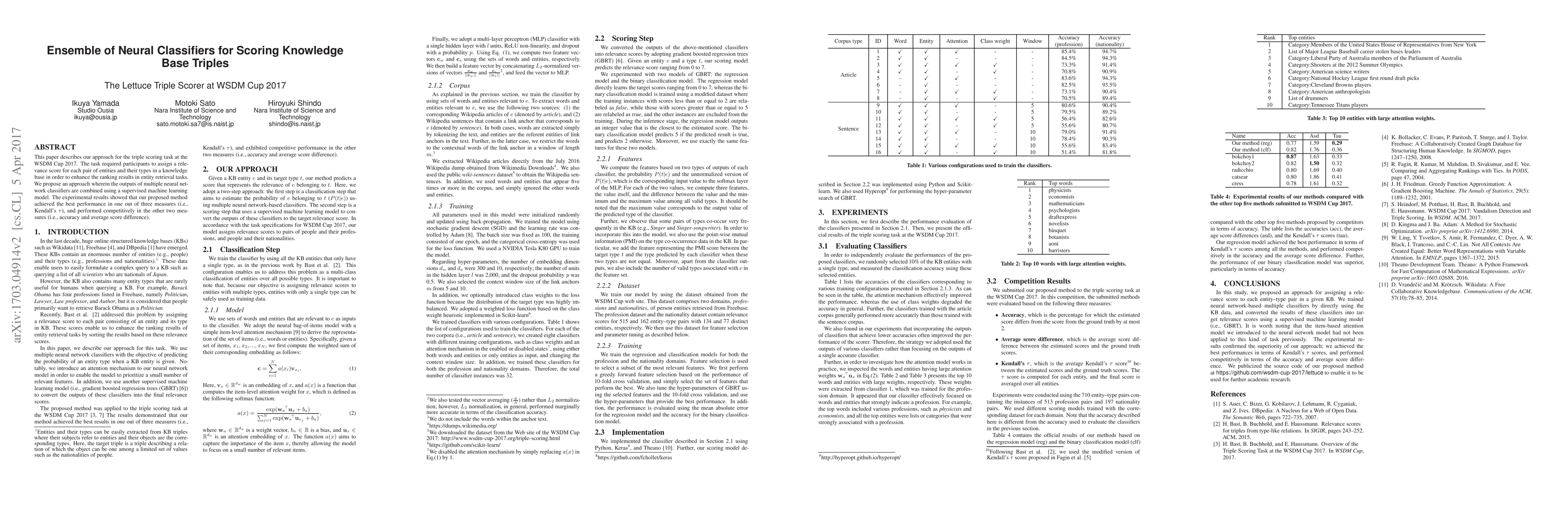 This paper proposes an ensemble of neural classifiers to score knowledge base triples for relevance, combining their outputs with a supervised model to enhance entity retrieval ranking. The method achieved top performance in one measure and competitive results in the others.
