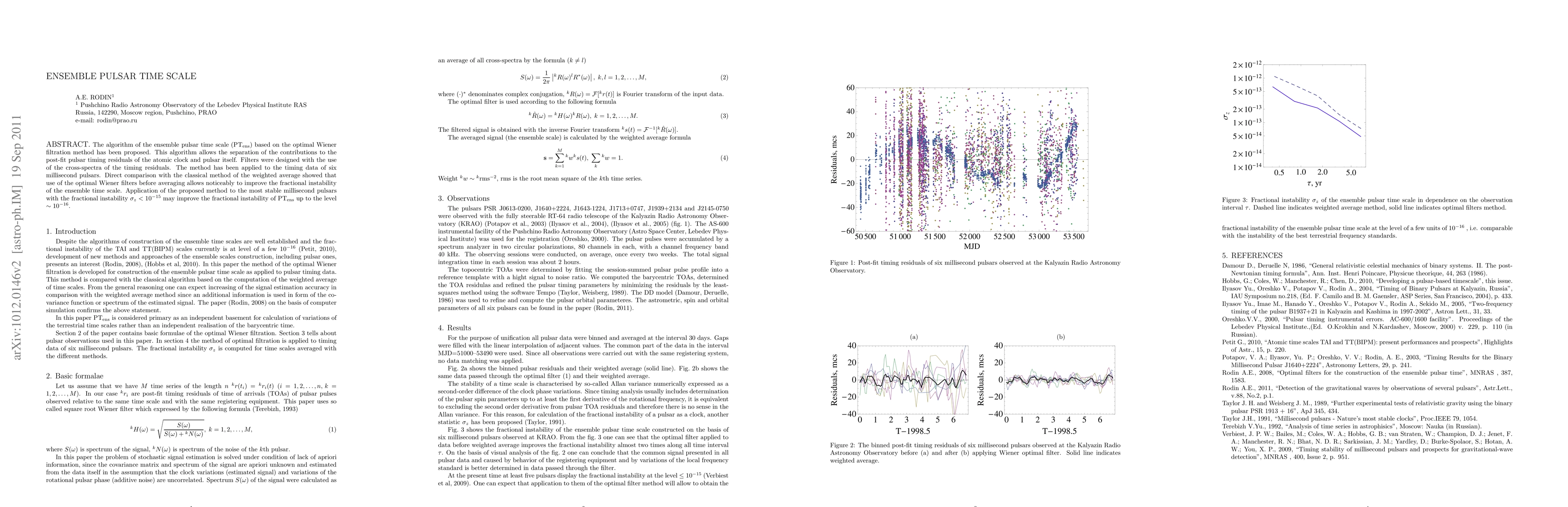 A new method called ensemble pulsar time scale (PT_{ m ens}) improves pulsar timing residual accuracy by using optimal Wiener filters, outperforming classical methods in fractional instability.
