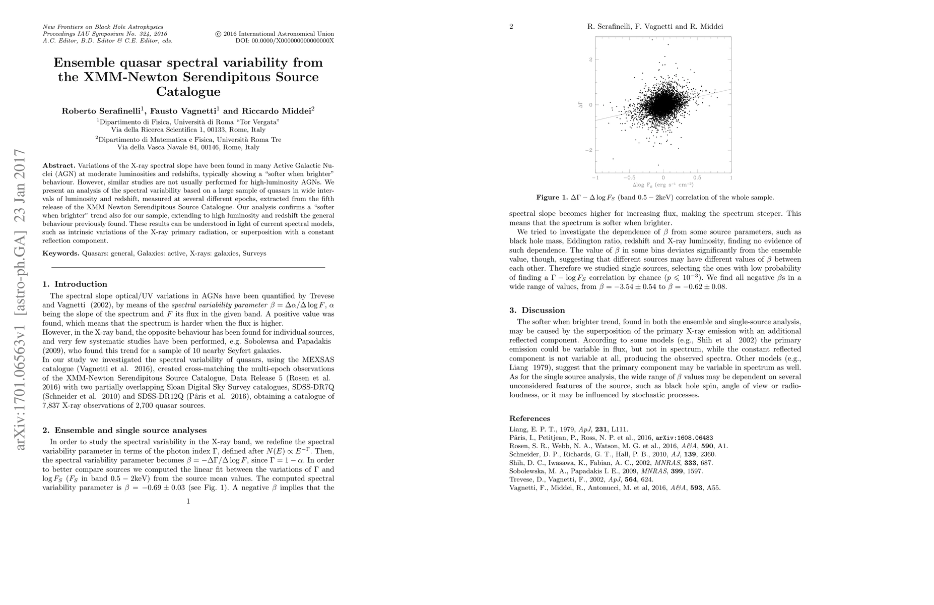 This study analyzes the spectral variability of a large sample of quasars from the XMM-Newton Serendipitous Source Catalogue, confirming a "softer when brighter" trend even among high-luminosity AGNs. The findings extend this behavior to higher luminosities and redshifts, aligning with current spectral models involving intrinsic variations or reflection components.