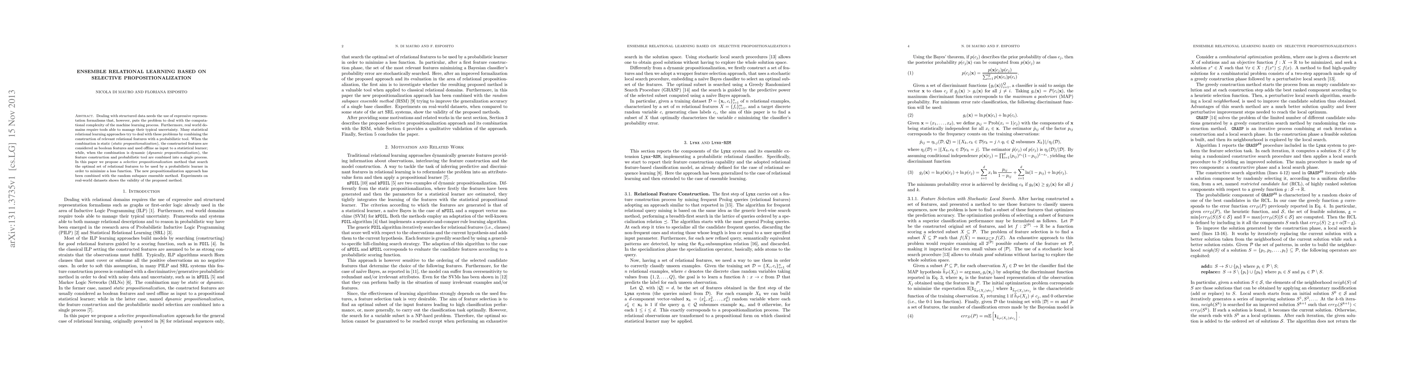 This paper proposes an ensemble relational learning method based on selective propositionalization to address the computational complexity and uncertainty in structured data. The proposed method optimizes the set of relational features for a probabilistic learner, combined with a random subspace ensemble, demonstrating effectiveness through experiments on real-world datasets.
