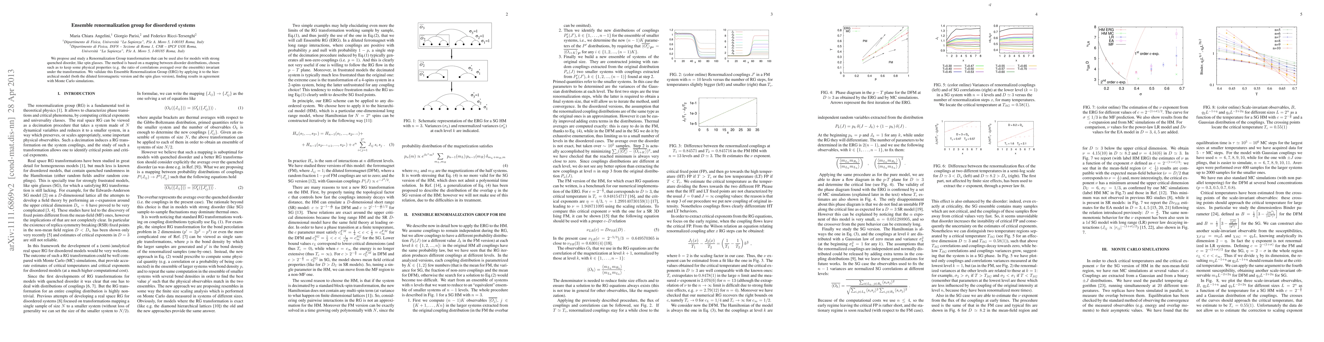 This paper proposes an ensemble renormalization group method for disordered systems, particularly spin glasses, maintaining key physical properties under transformation. The method is validated through application to the hierarchical model, showing agreement with Monte Carlo simulations.