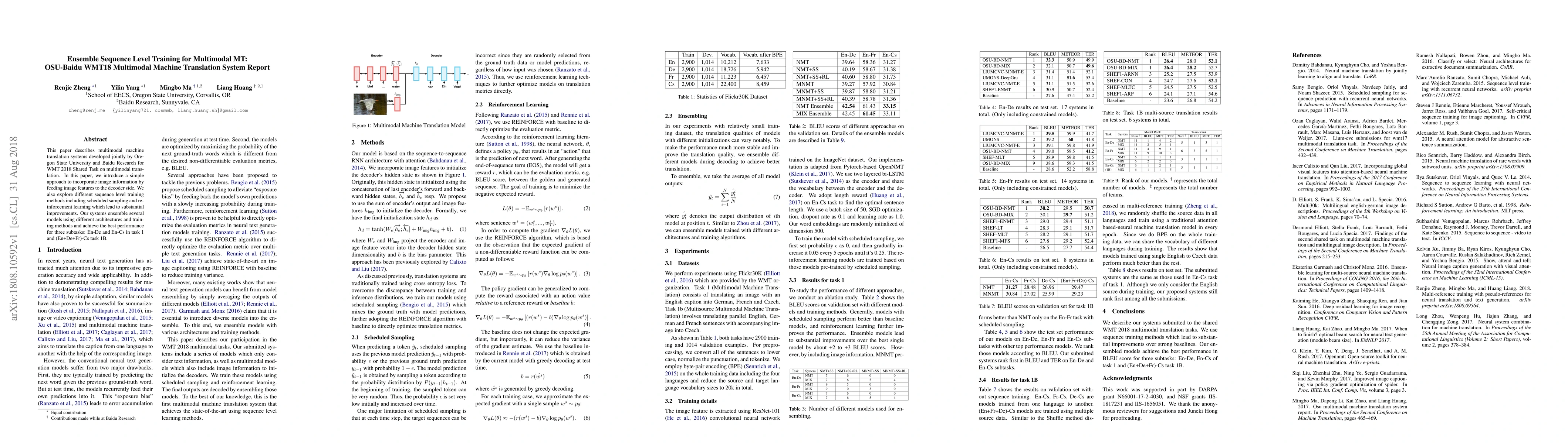 This paper presents an ensemble multimodal machine translation system developed by Oregon State University and Baidu for the WMT 2018 Shared Task, incorporating image features and employing sequence level training methods like scheduled sampling and reinforcement learning. The ensemble approach achieves top performance in three subtasks.