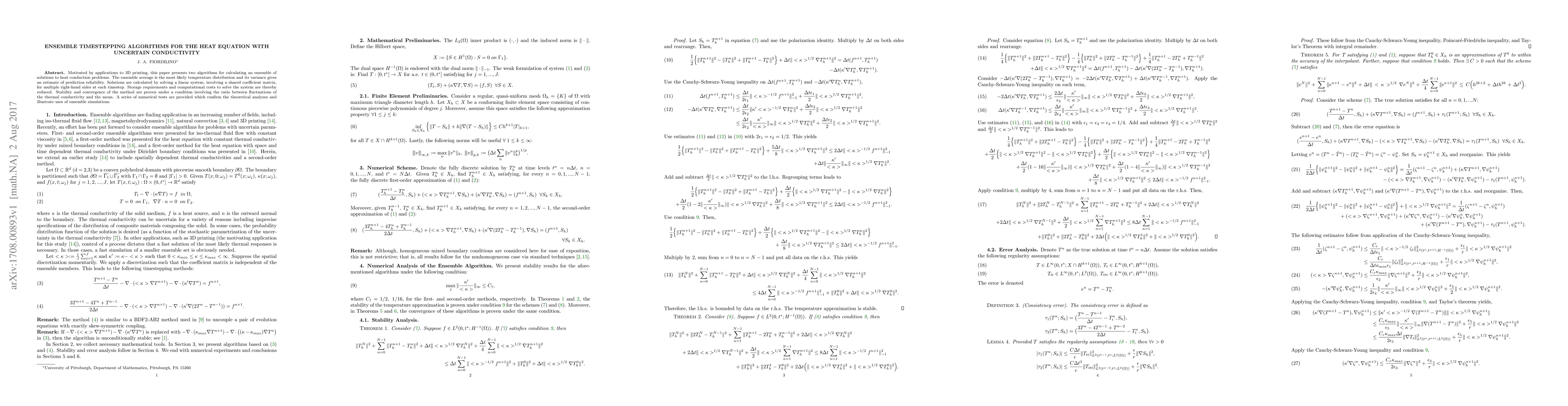 Motivated by applications to 3D printing, this paper presents two algorithms for calculating an ensemble of solutions to heat conduction problems. The ensemble average is the most likely temperature distribution and its variance gives an estimate of prediction reliability. Solutions are calculated by solving a linear system, involving a shared coefficient matrix, for multiple right-hand sides at each timestep. Storage requirements and computational costs to solve the system are thereby reduced. Stability and convergence of the method are proven under a condition involving the ratio between fluctuations of the thermal conductivity and the mean. A series of numerical tests are provided which confirm the theoretical analyses and illustrate uses of ensemble simulations.