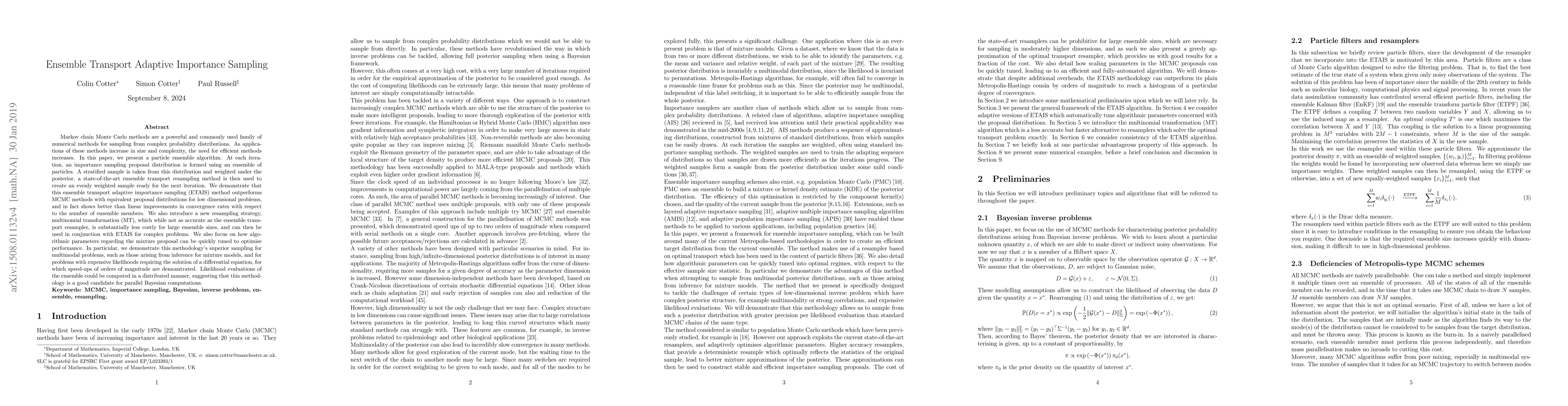 Markov chain Monte Carlo methods are a powerful and commonly used family of numerical methods for sampling from complex probability distributions. As applications of these methods increase in size and complexity, the need for efficient methods increases. In this paper, we present a particle ensemble algorithm. At each iteration, an importance sampling proposal distribution is formed using an ensemble of particles. A stratified sample is taken from this distribution and weighted under the posterior, a state-of-the-art ensemble transport resampling method is then used to create an evenly weighted sample ready for the next iteration. We demonstrate that this ensemble transport adaptive importance sampling (ETAIS) method outperforms MCMC methods with equivalent proposal distributions for low dimensional problems, and in fact shows better than linear improvements in convergence rates with respect to the number of ensemble members. We also introduce a new resampling strategy, multinomial transformation (MT), which while not as accurate as the ensemble transport resampler, is substantially less costly for large ensemble sizes, and can then be used in conjunction with ETAIS for complex problems. We also focus on how algorithmic parameters regarding the mixture proposal can be quickly tuned to optimise performance. In particular, we demonstrate this methodology's superior sampling for multimodal problems, such as those arising from inference for mixture models, and for problems with expensive likelihoods requiring the solution of a differential equation, for which speed-ups of orders of magnitude are demonstrated. Likelihood evaluations of the ensemble could be computed in a distributed manner, suggesting that this methodology is a good candidate for parallel Bayesian computations.