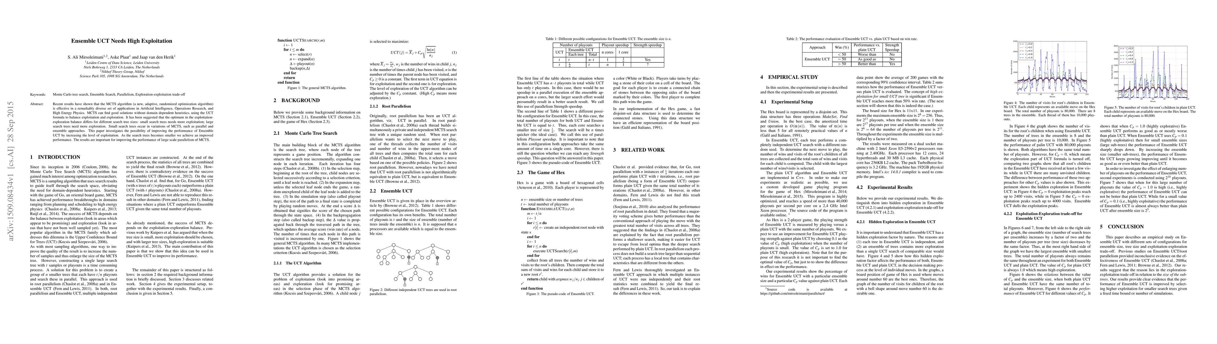 Recent results have shown that the MCTS algorithm (a new, adaptive, randomized optimization algorithm) is effective in a remarkably diverse set of applications in Artificial Intelligence, Operations Research, and High Energy Physics. MCTS can find good solutions without domain dependent heuristics, using the UCT formula to balance exploitation and exploration. It has been suggested that the optimum in the exploitation- exploration balance differs for different search tree sizes: small search trees needs more exploitation; large search trees need more exploration. Small search trees occur in variations of MCTS, such as parallel and ensemble approaches. This paper investigates the possibility of improving the performance of Ensemble UCT by increasing the level of exploitation. As the search trees becomes smaller we achieve an improved performance. The results are important for improving the performance of large scale parallelism of MCTS.