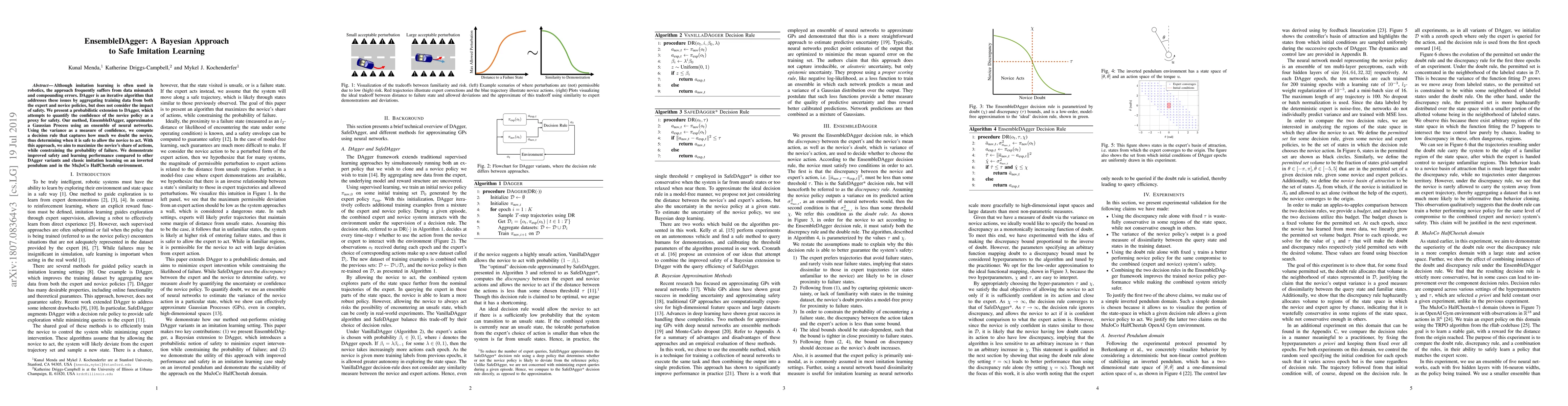 EnsembleDAgger introduces a probabilistic extension to the DAgger algorithm, using an ensemble of neural networks to approximate a Gaussian Process and quantify novice policy confidence as a safety measure. This approach enhances both safety and learning performance in imitation learning, as demonstrated in simulations of an inverted pendulum and MuJoCo HalfCheetah.