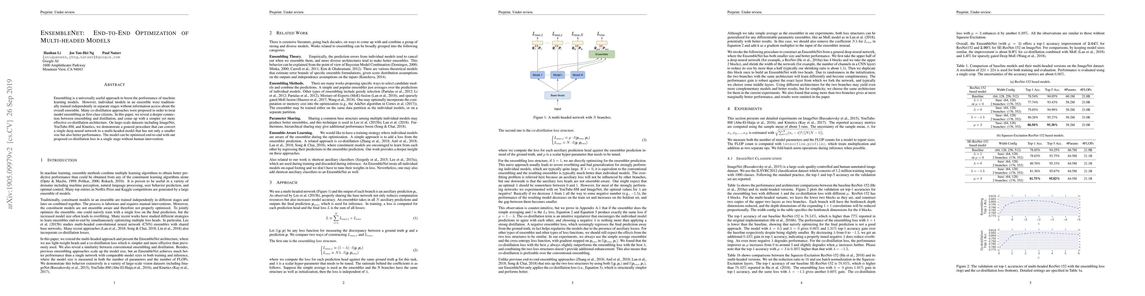 EnsembleNet proposes a novel co-distillation architecture to optimize multi-headed models end-to-end, enhancing performance without separate training stages. This method effectively converts a single deep neural network into a more efficient and superior multi-headed model on large-scale datasets.