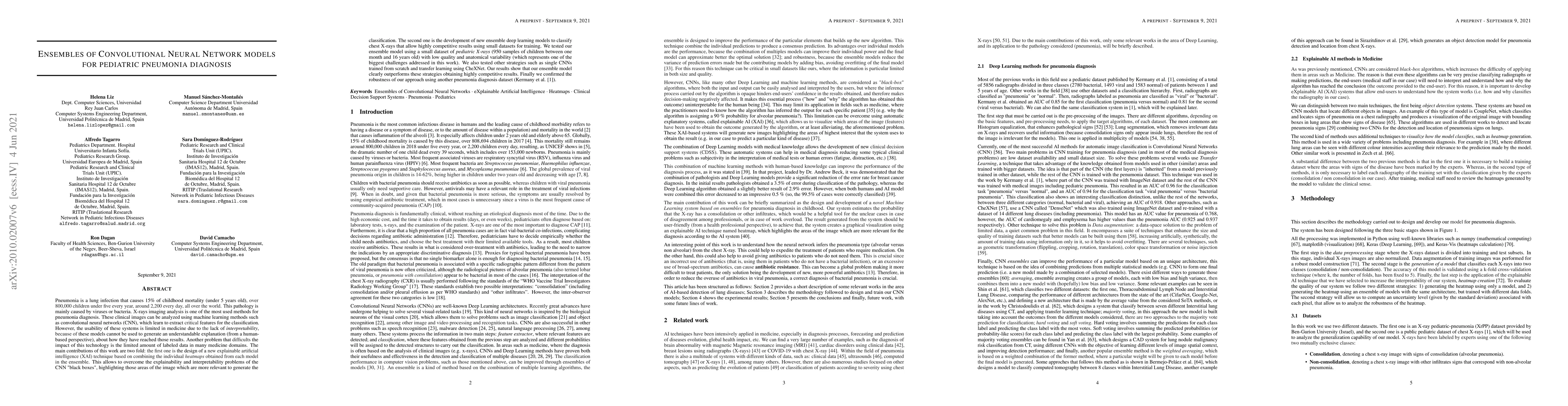 This paper proposes an ensemble of convolutional neural networks (CNNs) for diagnosing pediatric pneumonia from chest X-rays, addressing the lack of interpretability and limited labeled data in medical imaging. The authors introduce an explainable AI technique that combines heatmaps to highlight relevant image areas, enhancing model transparency. Their ensemble model achieves superior results on small datasets compared to single CNNs and transfer learning methods.