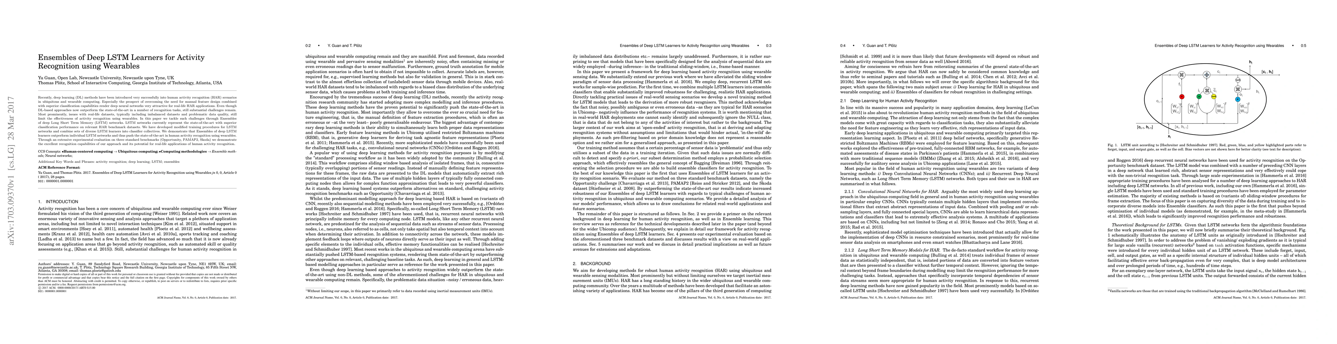The paper introduces Ensembles of deep LSTM learners for activity recognition using wearables, tackling challenges of real-life datasets with imbalanced data and problematic quality through modified training procedures for LSTM networks. Diverse LSTM learners are combined into classifier collectives, demonstrating improved performance over individual LSTM networks.