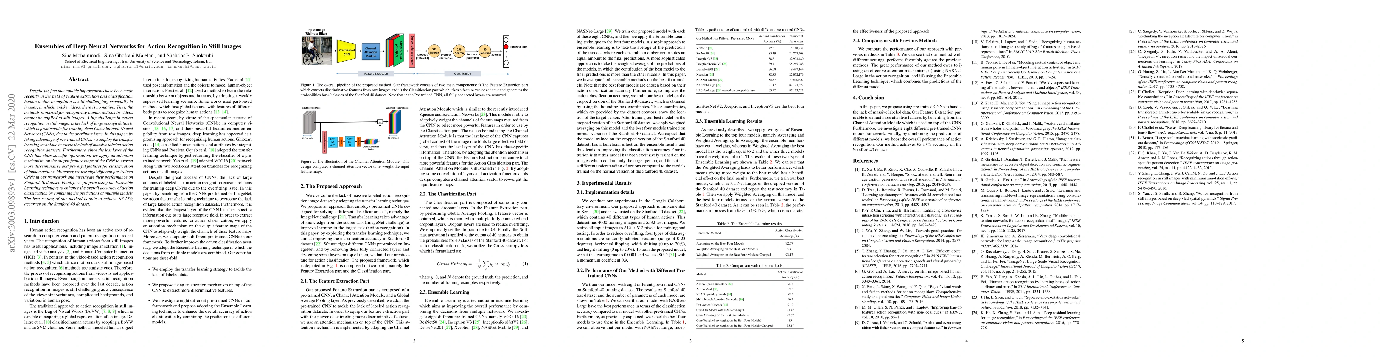 This paper proposes an ensemble of eight pre-trained CNNs for action recognition in still images, utilizing transfer learning and attention mechanisms to overcome dataset limitations and achieve 93.17% accuracy on the Stanford 40 dataset. Ensemble learning enhances classification accuracy by combining predictions from multiple models.