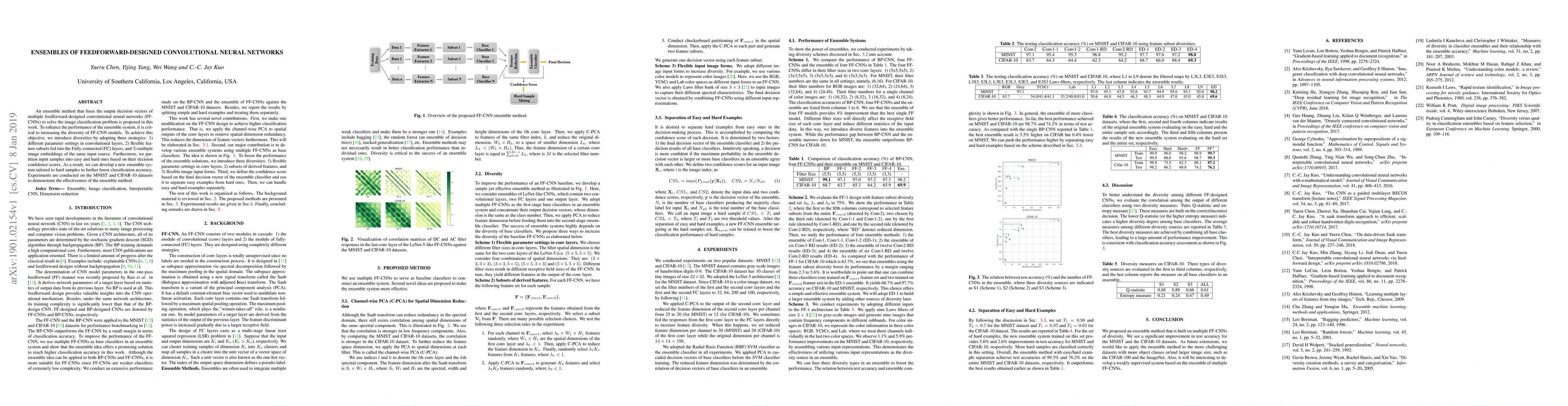 This paper proposes an ensemble method that combines multiple feedforward-designed convolutional neural networks (FF-CNNs) to improve image classification. The diversity among FF-CNNs is enhanced through varied parameter settings, feature subsets, and multiple image embeddings, leading to improved performance, especially for hard samples.