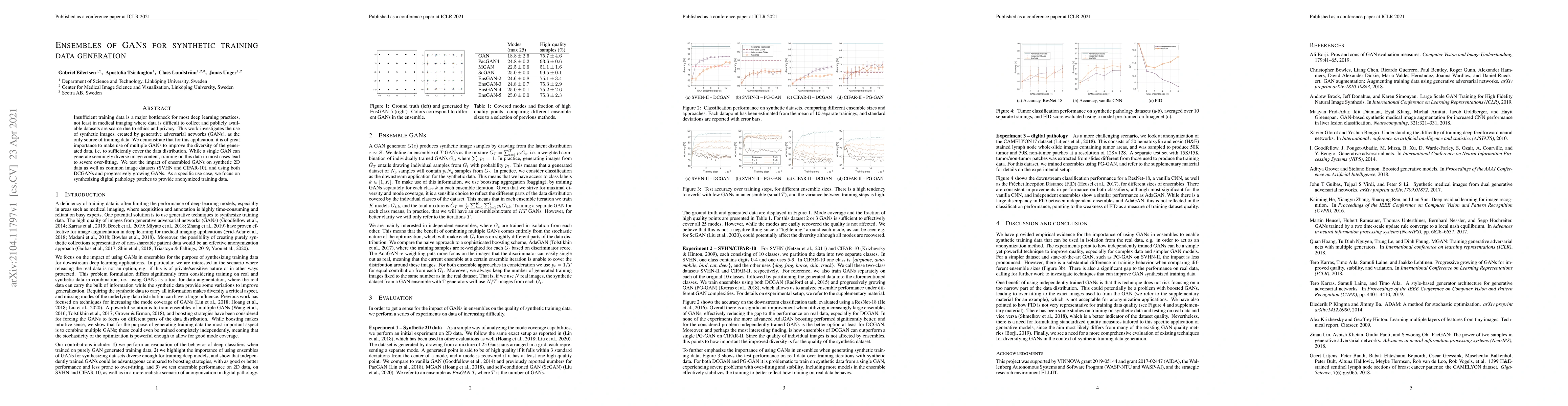 Insufficient training data is a major bottleneck for most deep learning practices, not least in medical imaging where data is difficult to collect and publicly available datasets are scarce due to ethics and privacy. This work investigates the use of synthetic images, created by generative adversarial networks (GANs), as the only source of training data. We demonstrate that for this application, it is of great importance to make use of multiple GANs to improve the diversity of the generated data, i.e. to sufficiently cover the data distribution. While a single GAN can generate seemingly diverse image content, training on this data in most cases lead to severe over-fitting. We test the impact of ensembled GANs on synthetic 2D data as well as common image datasets (SVHN and CIFAR-10), and using both DCGANs and progressively growing GANs. As a specific use case, we focus on synthesizing digital pathology patches to provide anonymized training data.