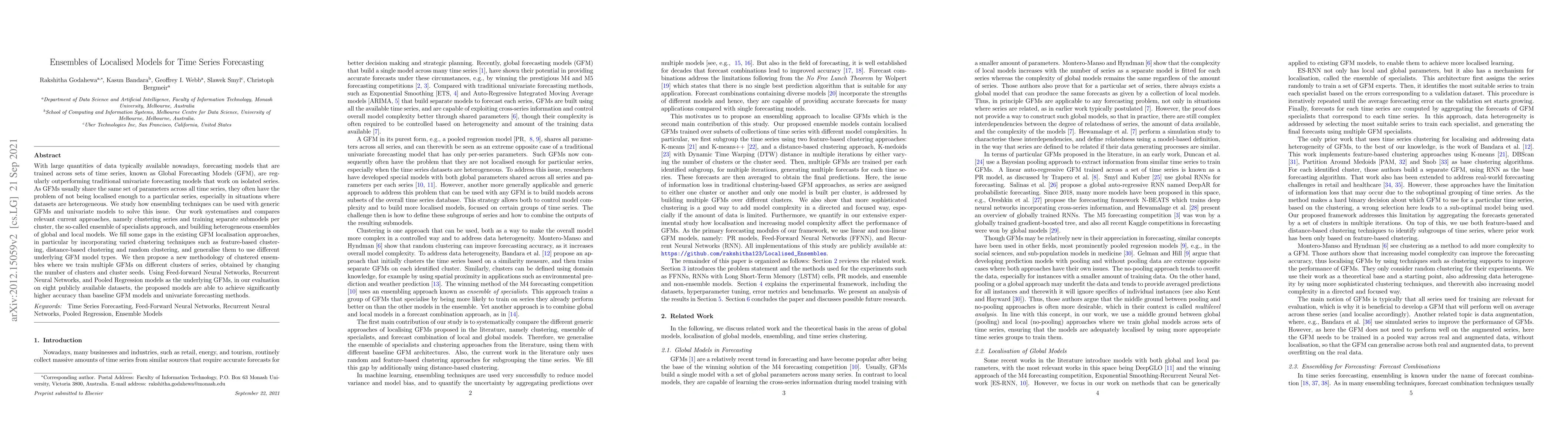 This paper explores ensemble methods for improving the localisation of Global Forecasting Models (GFM) in time series forecasting, especially in heterogeneous datasets. It proposes a new clustered ensemble approach, incorporating various clustering techniques and GFM types, and demonstrates superior accuracy over traditional GFMs and univariate models across eight datasets.