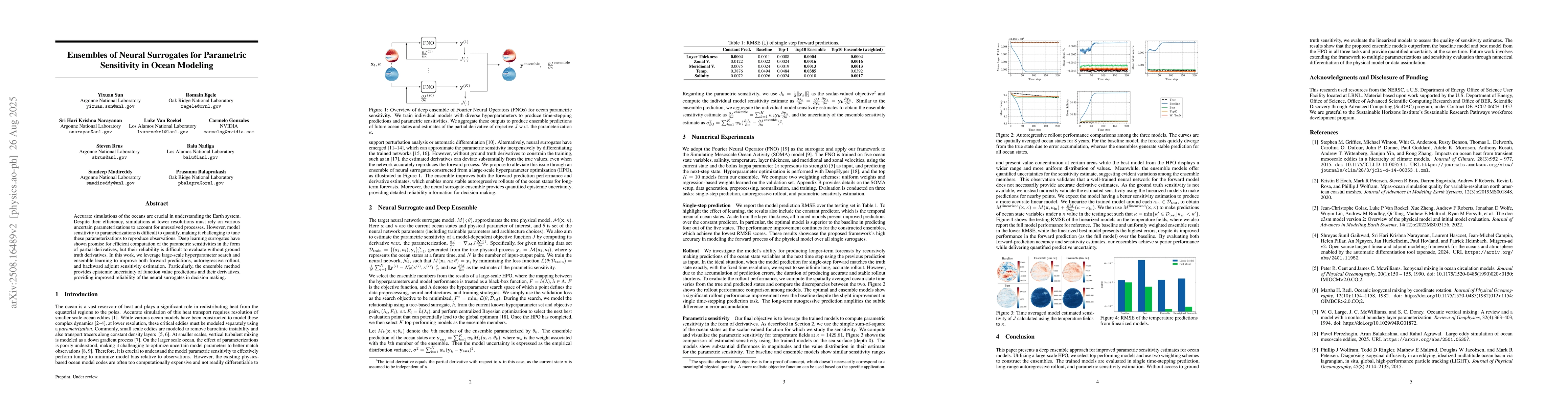 Accurate simulations of the oceans are crucial in understanding the Earth system. Despite their efficiency, simulations at lower resolutions must rely on various uncertain parameterizations to account for unresolved processes. However, model sensitivity to parameterizations is difficult to quantify, making it challenging to tune these parameterizations to reproduce observations. Deep learning surrogates have shown promise for efficient computation of the parametric sensitivities in the form of partial derivatives, but their reliability is difficult to evaluate without ground truth derivatives. In this work, we leverage large-scale hyperparameter search and ensemble learning to improve both forward predictions, autoregressive rollout, and backward adjoint sensitivity estimation. Particularly, the ensemble method provides epistemic uncertainty of function value predictions and their derivatives, providing improved reliability of the neural surrogates in decision making.