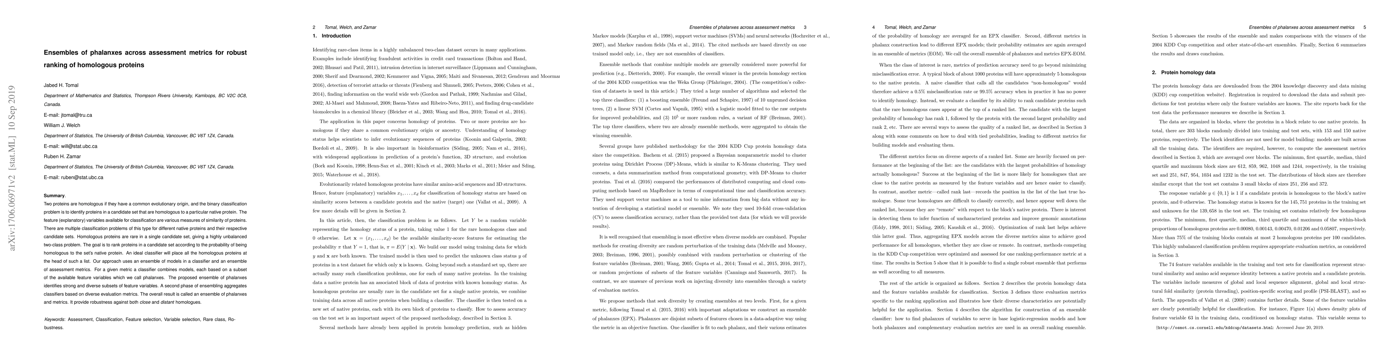 Two proteins are homologous if they have a common evolutionary origin, and the binary classification problem is to identify proteins in a candidate set that are homologous to a particular native protein. The feature (explanatory) variables available for classification are various measures of similarity of proteins. There are multiple classification problems of this type for different native proteins and their respective candidate sets. Homologous proteins are rare in a single candidate set, giving a highly unbalanced two-class problem. The goal is to rank proteins in a candidate set according to the probability of being homologous to the set's native protein. An ideal classifier will place all the homologous proteins at the head of such a list. Our approach uses an ensemble of models in a classifier and an ensemble of assessment metrics. For a given metric a classifier combines models, each based on a subset of the available feature variables which we call phalanxes. The proposed ensemble of phalanxes identifies strong and diverse subsets of feature variables. A second phase of ensembling aggregates classifiers based on diverse evaluation metrics. The overall result is called an ensemble of phalanxes and metrics. It provide robustness against both close and distant homologues.