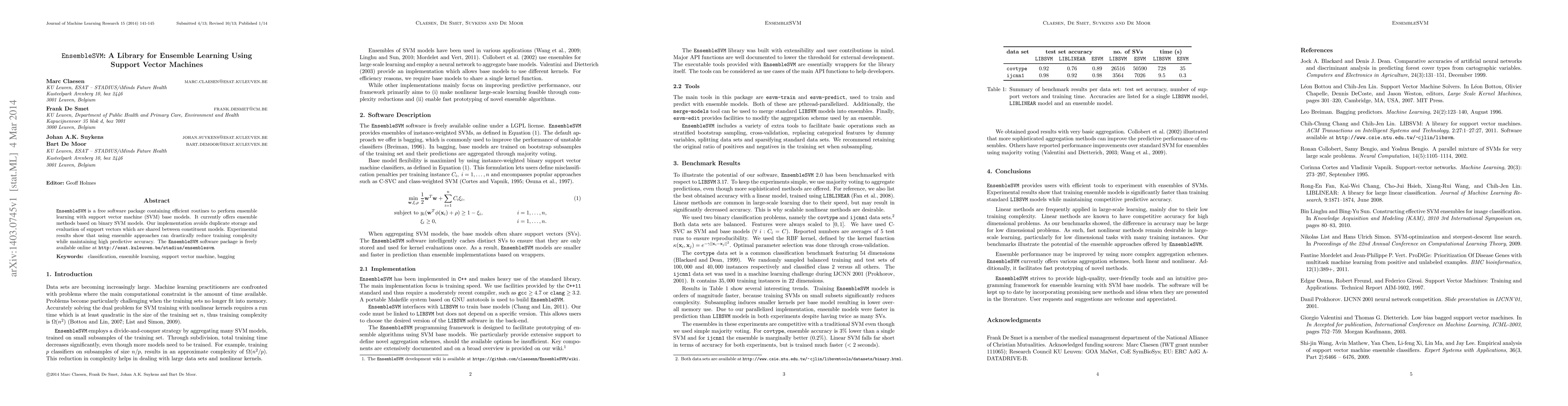 EnsembleSVM is a free software library for ensemble learning using support vector machines (SVMs), offering efficient routines to reduce training complexity while maintaining high predictive accuracy. It avoids redundant storage and evaluation of shared support vectors, making it a powerful tool for ensemble methods based on binary SVM models.