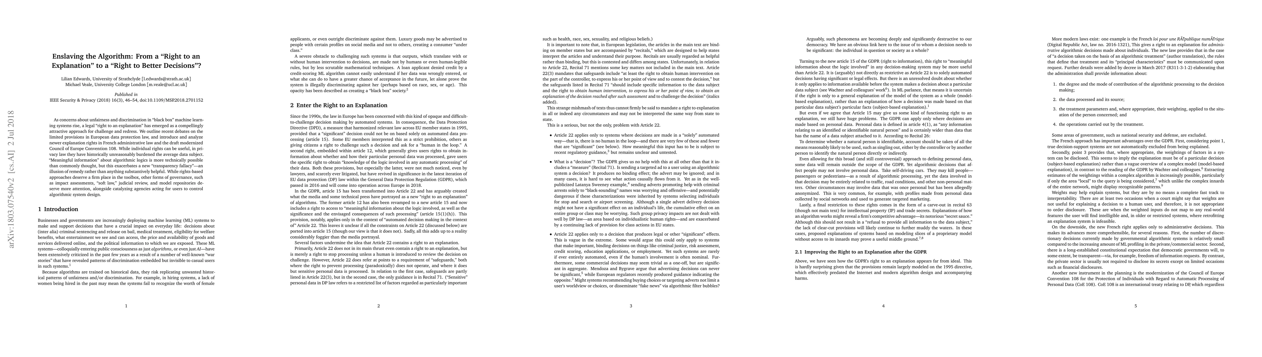 As concerns about unfairness and discrimination in "black box" machine learning systems rise, a legal "right to an explanation" has emerged as a compellingly attractive approach for challenge and redress. We outline recent debates on the limited provisions in European data protection law, and introduce and analyze newer explanation rights in French administrative law and the draft modernized Council of Europe Convention 108. While individual rights can be useful, in privacy law they have historically unreasonably burdened the average data subject. "Meaningful information" about algorithmic logics is more technically possible than commonly thought, but this exacerbates a new "transparency fallacy"---an illusion of remedy rather than anything substantively helpful. While rights-based approaches deserve a firm place in the toolbox, other forms of governance, such as impact assessments, "soft law," judicial review, and model repositories deserve more attention, alongside catalyzing agencies acting for users to control algorithmic system design.