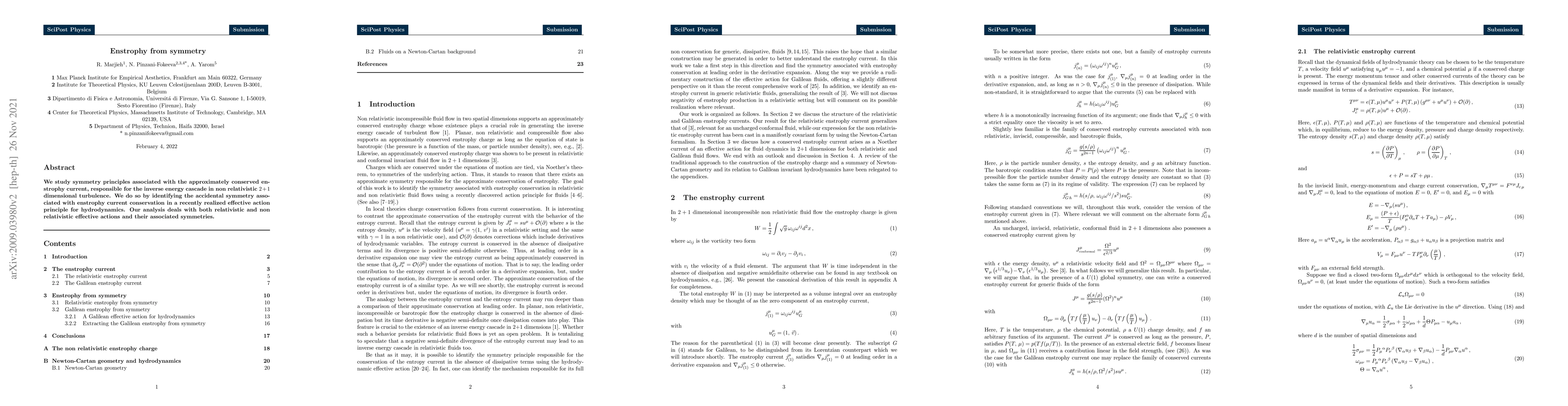 This paper explores symmetry principles linked to the conserved enstrophy current in non-relativistic 2+1 dimensional turbulence, focusing on the inverse energy cascade. It identifies an accidental symmetry in an effective action principle for hydrodynamics, comparing relativistic and non-relativistic effective actions and their symmetries.