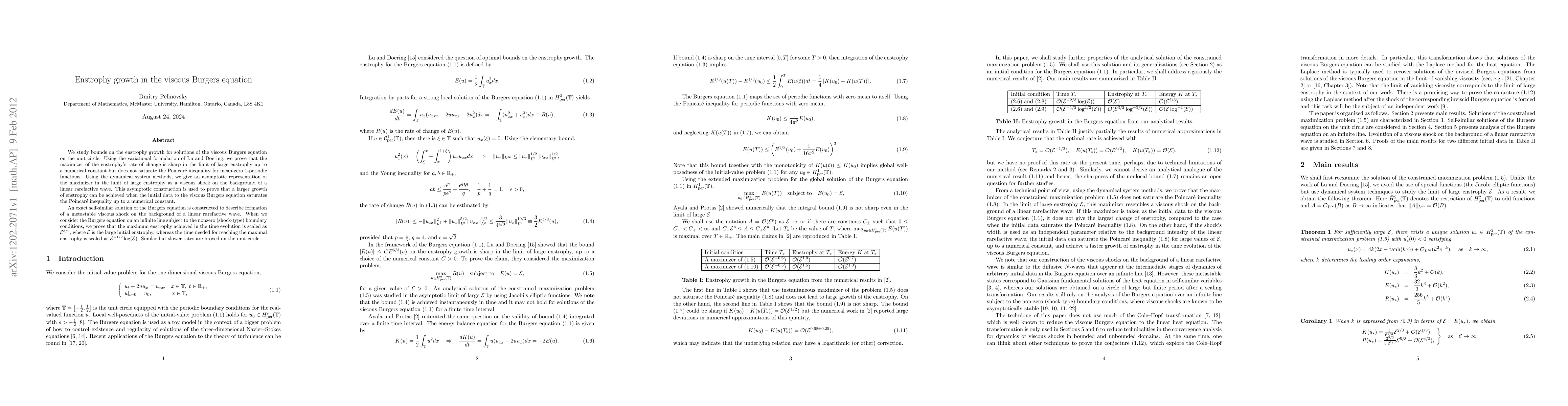 This paper investigates bounds on enstrophy growth in the viscous Burgers equation, proving that the rate of enstrophy change is maximized asymptotically by a viscous shock on a rarefactive wave background. It also constructs an exact self-similar solution describing a metastable viscous shock and shows that maximum enstrophy scales as $\mathcal{E}^{3/2}$ on an infinite line with shock-type boundary conditions.