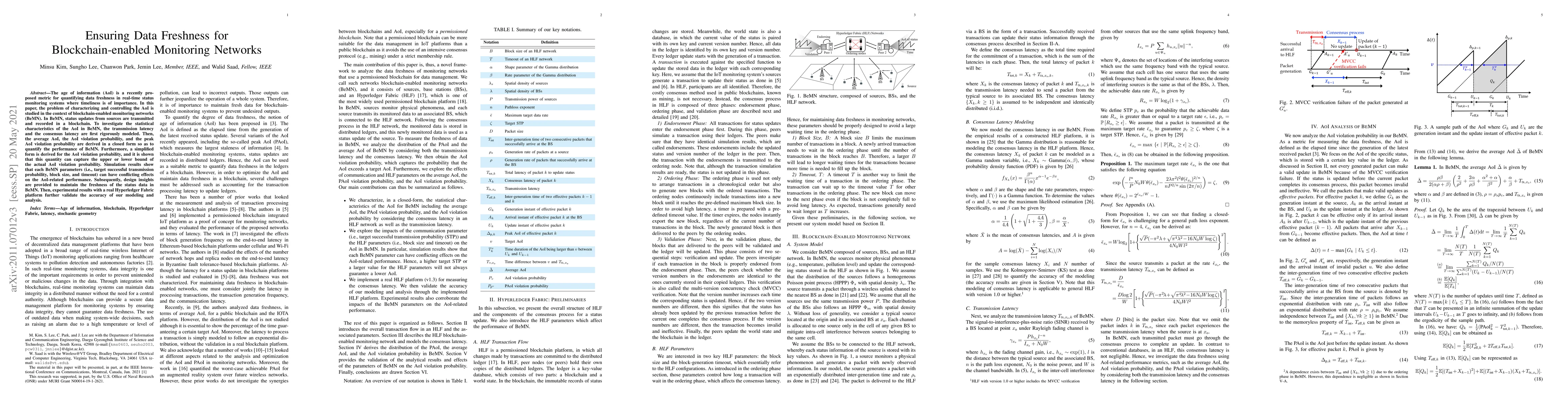 This paper studies the Age of Information (AoI) in blockchain-enabled monitoring networks (BeMN), modeling transmission and consensus latencies to derive statistical characteristics of AoI. It provides insights into maintaining data freshness and validates the model with Hyperledger Fabric experiments.