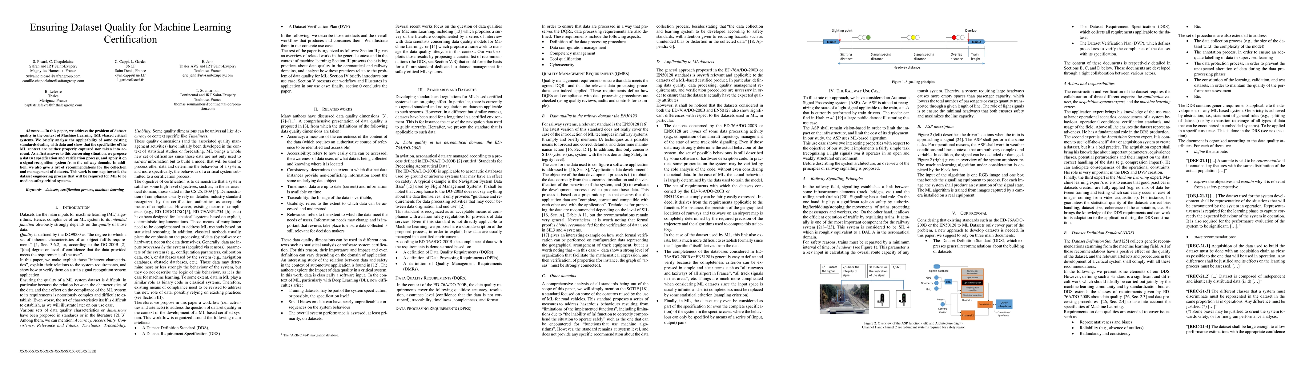 In this paper, we address the problem of dataset quality in the context of Machine Learning (ML)-based critical systems. We briefly analyse the applicability of some existing standards dealing with data and show that the specificities of the ML context are neither properly captured nor taken into ac-count. As a first answer to this concerning situation, we propose a dataset specification and verification process, and apply it on a signal recognition system from the railway domain. In addi-tion, we also give a list of recommendations for the collection and management of datasets. This work is one step towards the dataset engineering process that will be required for ML to be used on safety critical systems.