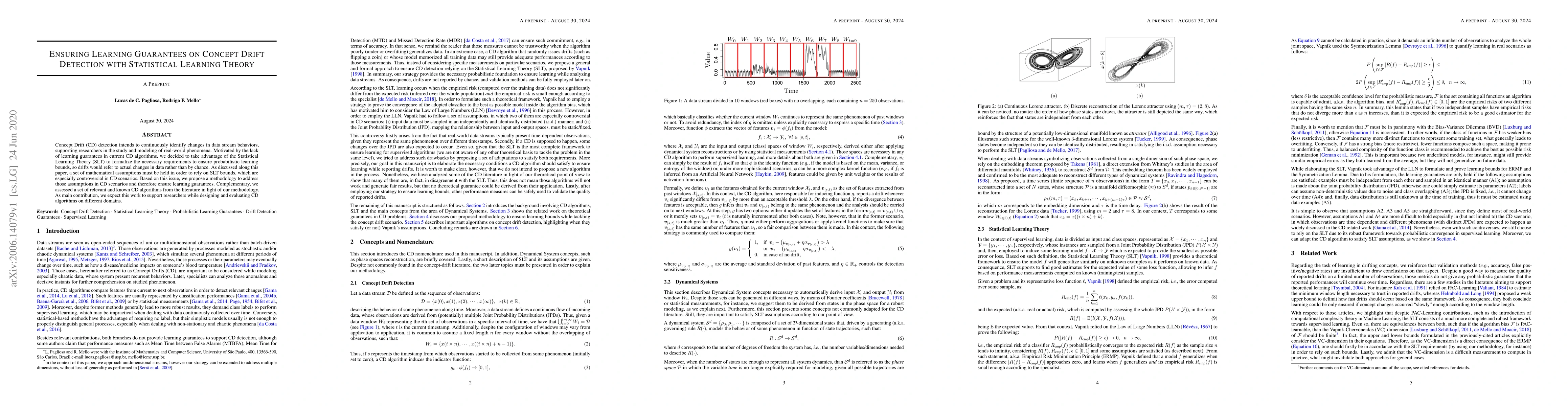 Concept Drift (CD) detection intends to continuously identify changes in data stream behaviors, supporting researchers in the study and modeling of real-world phenomena. Motivated by the lack of learning guarantees in current CD algorithms, we decided to take advantage of the Statistical Learning Theory (SLT) to formalize the necessary requirements to ensure probabilistic learning bounds, so drifts would refer to actual changes in data rather than by chance. As discussed along this paper, a set of mathematical assumptions must be held in order to rely on SLT bounds, which are especially controversial in CD scenarios. Based on this issue, we propose a methodology to address those assumptions in CD scenarios and therefore ensure learning guarantees. Complementary, we assessed a set of relevant and known CD algorithms from the literature in light of our methodology. As main contribution, we expect this work to support researchers while designing and evaluating CD algorithms on different domains.