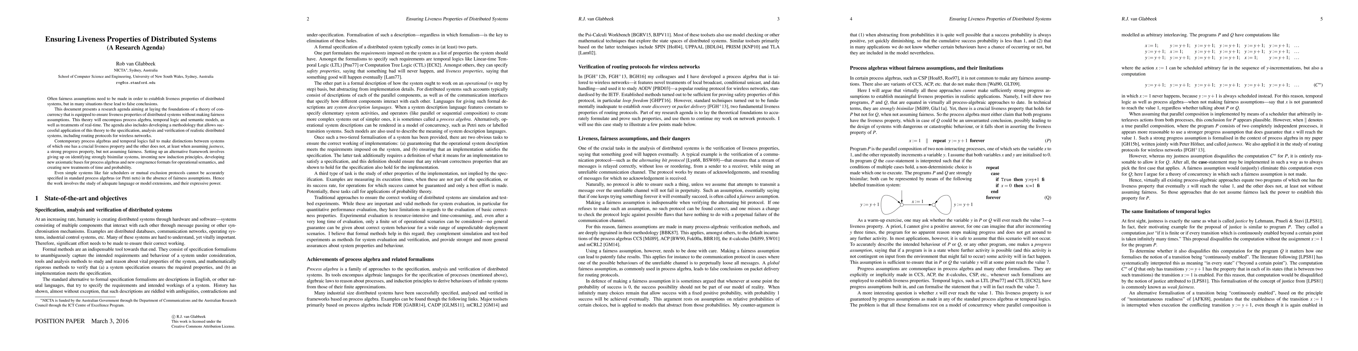 Often fairness assumptions need to be made in order to establish liveness properties of distributed systems, but in many situations these lead to false conclusions. This document presents a research agenda aiming at laying the foundations of a theory of concurrency that is equipped to ensure liveness properties of distributed systems without making fairness assumptions. This theory will encompass process algebra, temporal logic and semantic models, as well as treatments of real-time. The agenda also includes developing a methodology that allows successful application of this theory to the specification, analysis and verification of realistic distributed systems, including routing protocols for wireless networks. Contemporary process algebras and temporal logics fail to make distinctions between systems of which one has a crucial liveness property and the other does not, at least when assuming justness, a strong progress property, but not assuming fairness. Setting up an alternative framework involves giving up on identifying strongly bisimilar systems, inventing new induction principles, developing new axiomatic bases for process algebras and new congruence formats for operational semantics, and creating new treatments of time and probability. Even simple systems like fair schedulers or mutual exclusion protocols cannot be accurately specified in standard process algebras (or Petri nets) in the absence of fairness assumptions. Hence the work involves the study of adequate language or model extensions, and their expressive power.