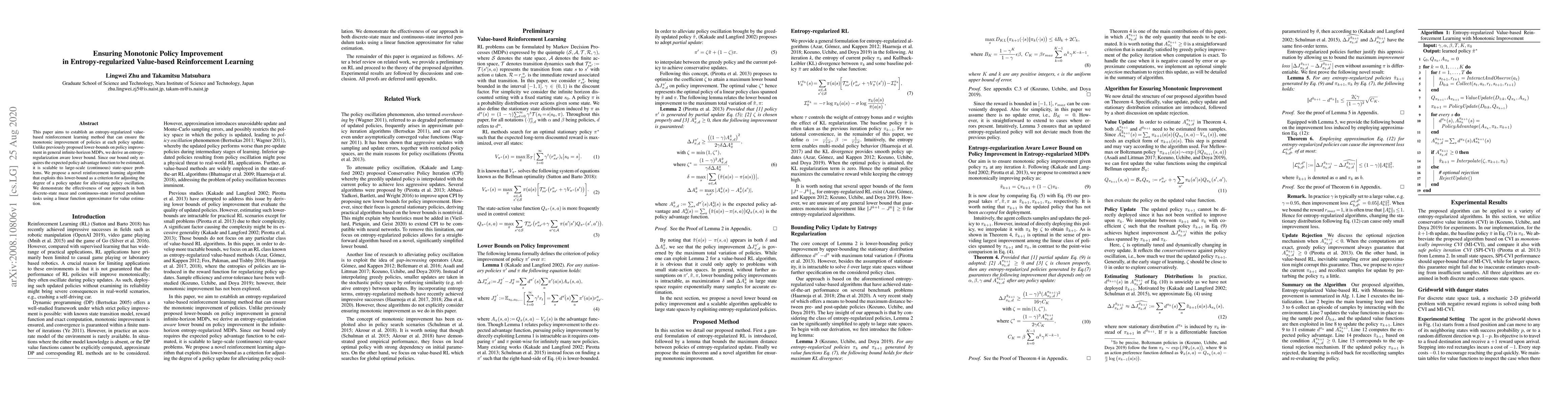 This paper introduces an entropy-regularized value-based reinforcement learning method ensuring monotonic policy improvement through a novel entropy-aware lower bound, scalable to large state spaces. The proposed algorithm adjusts policy updates based on this bound to mitigate policy oscillation, validated in discrete and continuous tasks.