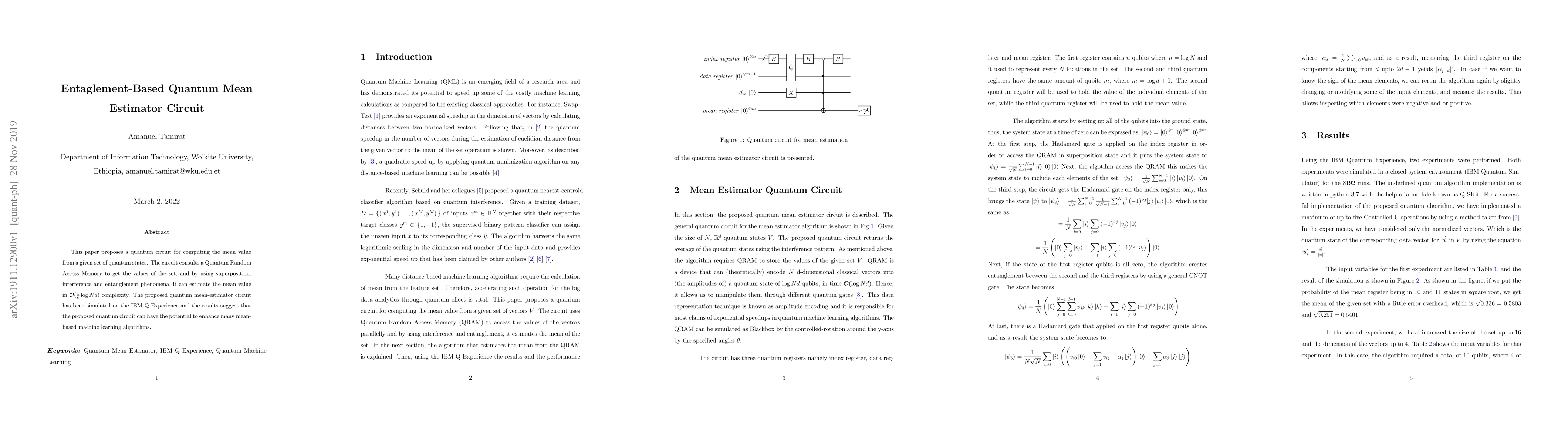 This paper introduces a quantum circuit leveraging entanglement and quantum interference to estimate the mean of a set of quantum states, achieving $\mathcal{O}(\frac{1}{\epsilon}\log{Nd})$ complexity. Simulations on IBM Q Experience indicate its potential to improve mean-based machine learning algorithms.