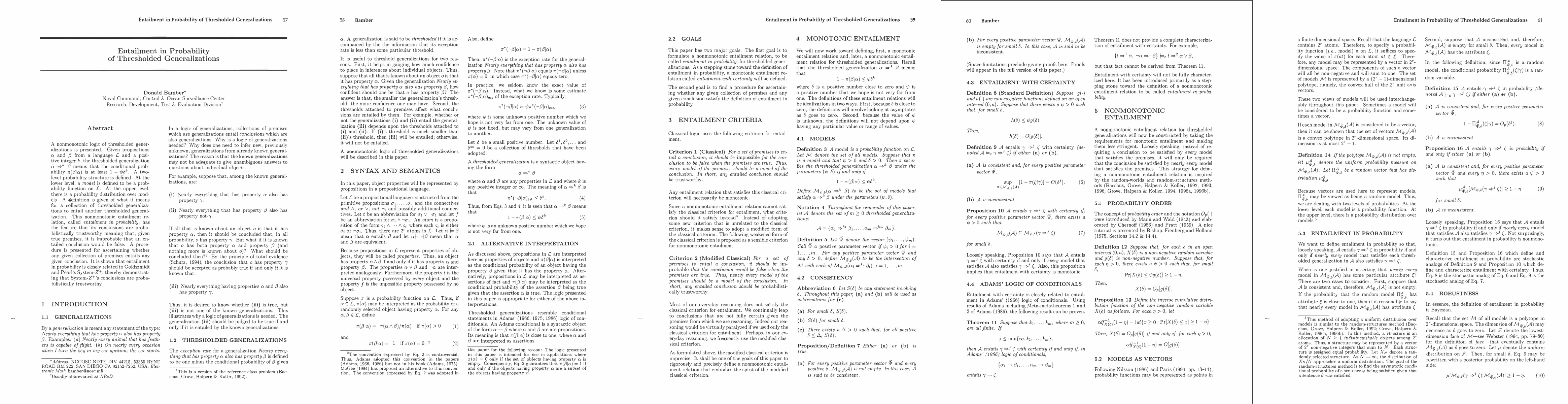 A nonmonotonic logic of thresholded generalizations is presented. Given propositions A and B from a language L and a positive integer k, the thresholded generalization A=>B{k} means that the conditional probability P(B|A) falls short of one by no more than c*d^k. A two-level probability structure is defined. At the lower level, a model is defined to be a probability function on L. At the upper level, there is a probability distribution over models. A definition is given of what it means for a collection of thresholded generalizations to entail another thresholded generalization. This nonmonotonic entailment relation, called "entailment in probability", has the feature that its conclusions are "probabilistically trustworthy" meaning that, given true premises, it is improbable that an entailed conclusion would be false. A procedure is presented for ascertaining whether any given collection of premises entails any given conclusion. It is shown that entailment in probability is closely related to Goldszmidt and Pearl's System-Z^+, thereby demonstrating that the conclusions of System-Z^+ are probabilistically trustworthy.