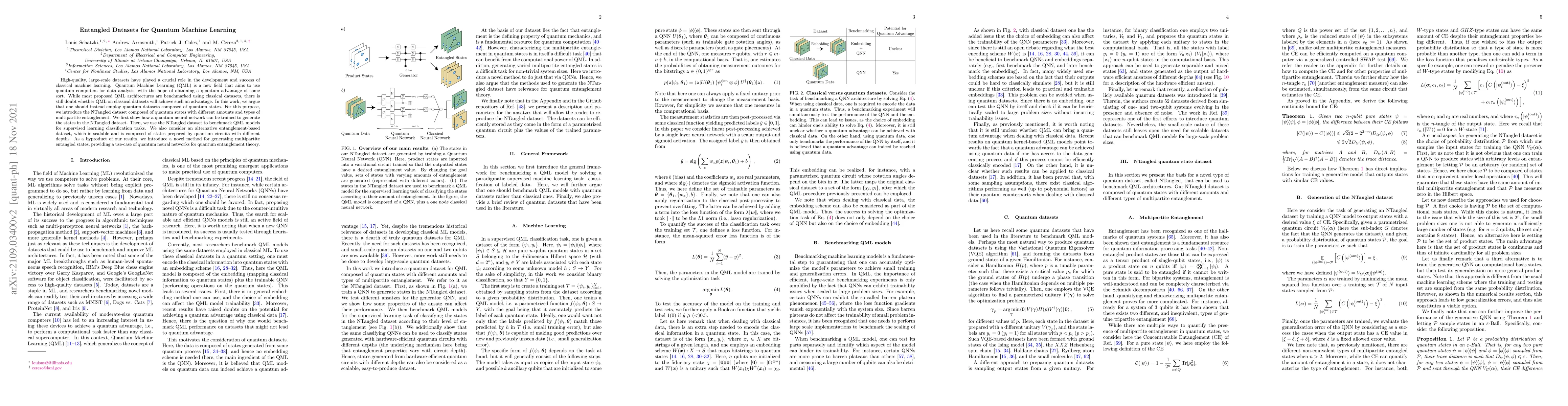 High-quality, large-scale datasets have played a crucial role in the development and success of classical machine learning. Quantum Machine Learning (QML) is a new field that aims to use quantum computers for data analysis, with the hope of obtaining a quantum advantage of some sort. While most proposed QML architectures are benchmarked using classical datasets, there is still doubt whether QML on classical datasets will achieve such an advantage. In this work, we argue that one should instead employ quantum datasets composed of quantum states. For this purpose, we introduce the NTangled dataset composed of quantum states with different amounts and types of multipartite entanglement. We first show how a quantum neural network can be trained to generate the states in the NTangled dataset. Then, we use the NTangled dataset to benchmark QML models for supervised learning classification tasks. We also consider an alternative entanglement-based dataset, which is scalable and is composed of states prepared by quantum circuits with different depths. As a byproduct of our results, we introduce a novel method for generating multipartite entangled states, providing a use-case of quantum neural networks for quantum entanglement theory.
