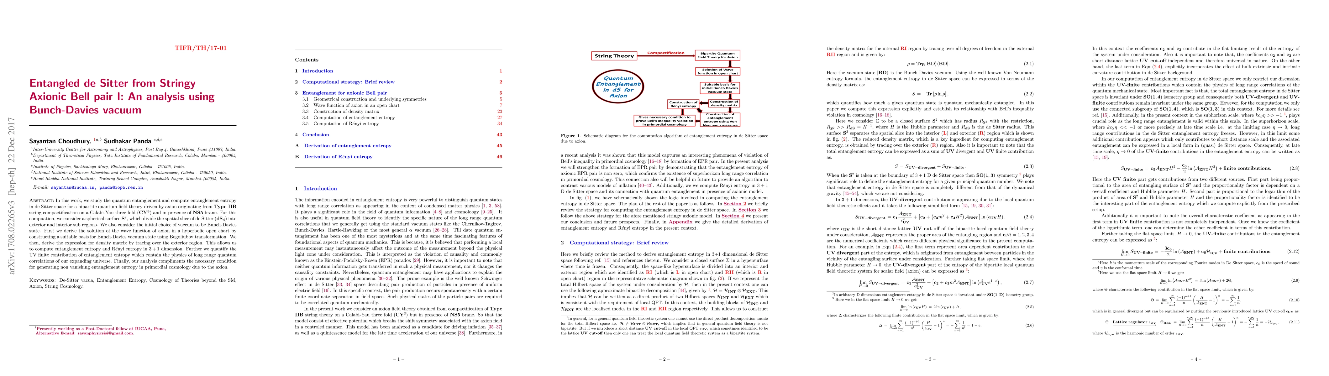 This paper investigates quantum entanglement and computes entanglement entropy in de Sitter space using a bipartite quantum field theory driven by an axion from Type IIB string compactification. The analysis employs the Bunch Davies vacuum state and derives the wave function of the axion, subsequently calculating entanglement and Rényi entropy to explore long-range quantum correlations in an expanding universe.