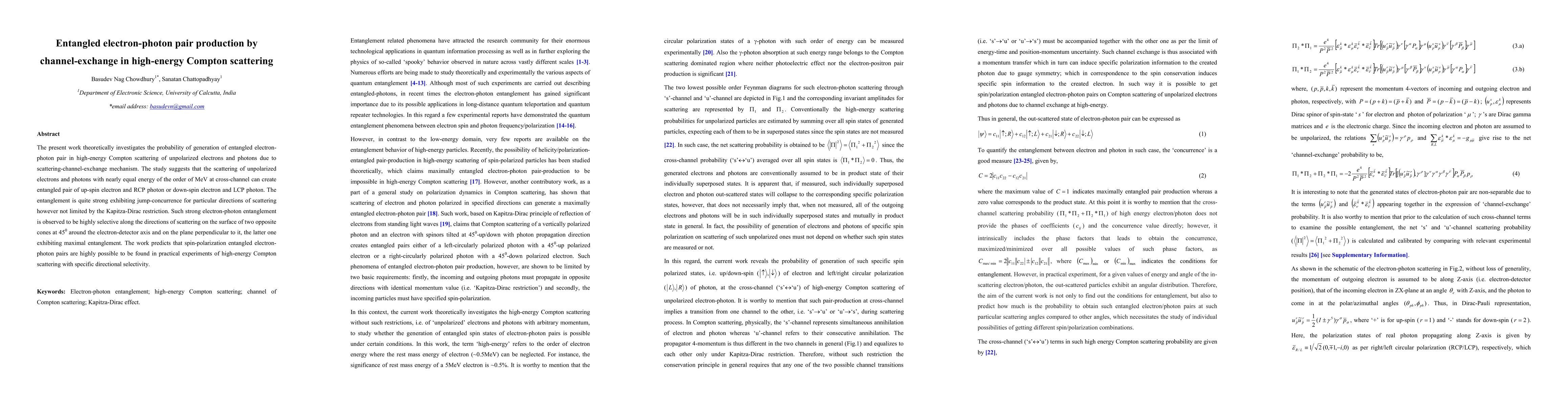 The present work theoretically investigates the probability of generation of entangled electron-photon pair in high-energy Compton scattering of unpolarized electrons and photons due to scattering-channel-exchange mechanism. The study suggests that the scattering of unpolarized electrons and photons with nearly equal energy of the order of MeV at cross-channel can create entangled pair of up-spin electron and RCP photon or down-spin electron and LCP photon. The entanglement is quite strong exhibiting jump-concurrence for particular directions of scattering however not limited by the Kapitza-Dirac restriction. Such strong electron-photon entanglement is observed to be highly selective along the directions of scattering on the surface of two opposite cones at 45 degree around the electron-detector axis and on the plane perpendicular to it, the latter one exhibiting maximal entanglement. The work predicts that spin-polarization entangled electron-photon pairs are highly possible to be found in practical experiments of high-energy Compton scattering with specific directional selectivity.