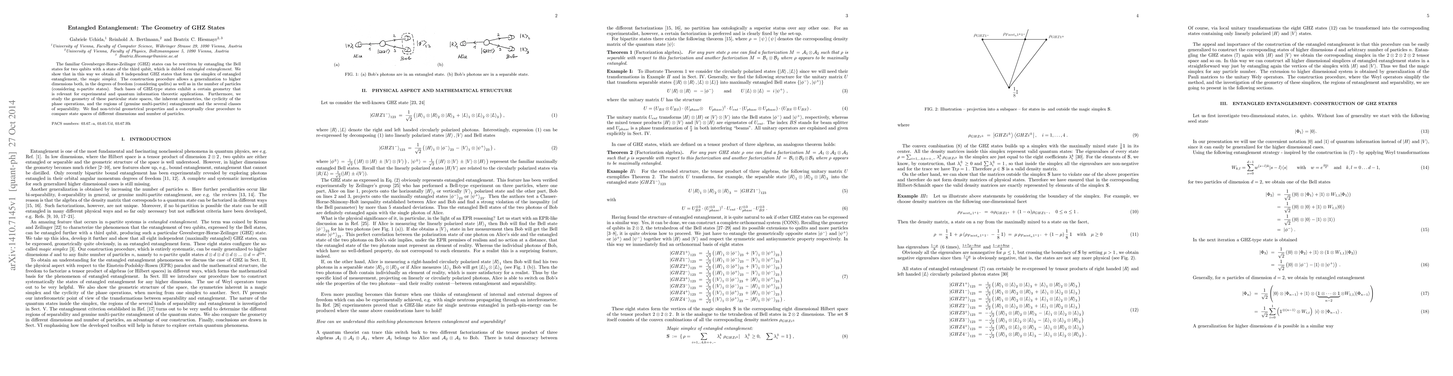 The familiar Greenberger-Horne-Zeilinger (GHZ) states can be rewritten by entangling the Bell states for two qubits with a state of the third qubit, which is dubbed entangled entanglement. We show that in this way we obtain all 8 independent GHZ states that form the simplex of entangled entanglement, the magic simplex. The construction procedure allows a generalization to higher dimensions both, in the degrees of freedom (considering qudits) as well as in the number of particles (considering n-partite states). Such bases of GHZ-type states exhibit a certain geometry that is relevant for experimental and quantum information theoretic applications. Furthermore, we study the geometry of these particular state spaces, the inherent symmetries, the cyclicity of the phase operations, and the regions of (genuine multi-partite) entanglement and the several classes of separability. We find non-trivial geometrical properties and a conceptually clear procedure to compare state spaces of different dimensions and number of particles.